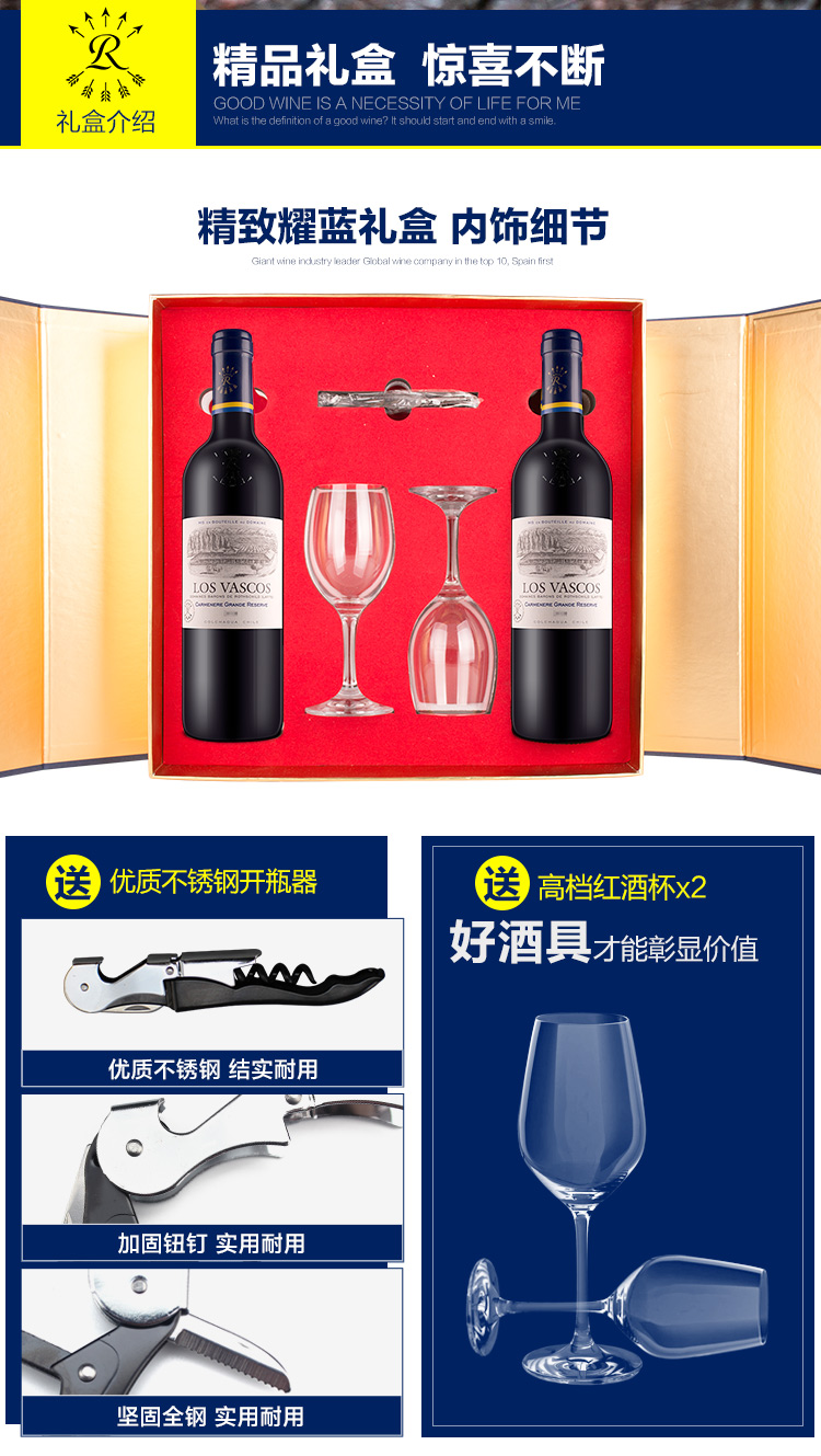 口感:饱满;特性:精品葡萄酒;国产/进口:进口;产地:智利;适用场景:礼节拜访,商务宴请,家庭聚会;包装:礼盒装;容量:750mL;甜度:干型;类别:红葡萄酒;葡萄品种:佳美娜(Carmenere);保质期:见背标;酒精度:14(仅供参考);原产地:智利;存储方法:避光、卧放;容量:750,ml;产品重量:4.1kg;包装清单:耀蓝精品礼盒*1、裸瓶酒*2、礼袋*1、酒刀*1、红酒杯*2;