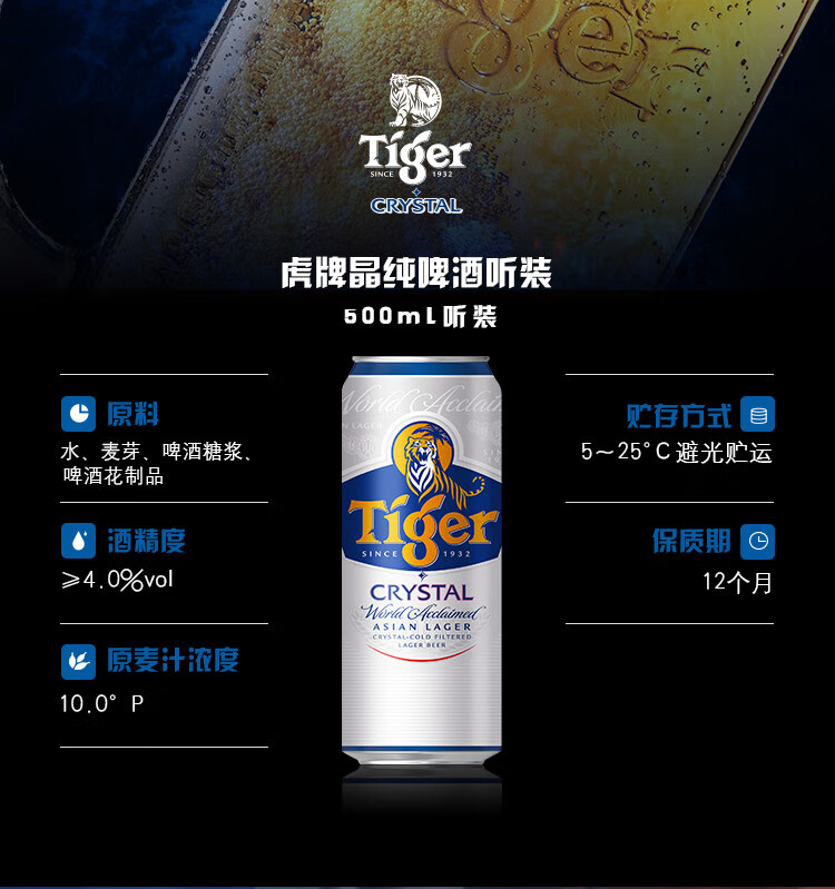 国产/进口:国产;产地:中国大陆;适用场景:野餐出游,礼节拜访,家庭聚会,自斟自饮,情侣约会,烧烤撸串,派对必备,酒吧夜店;包装:听装;容量:500mL;类别:黄啤酒;原料:水、麦芽、啤酒花;系列:晶纯;保质期:365天;酒精度:≥4.0vol;原产地:中国大陆;原麦汁浓度:10.0°P;存储方法:5℃-25℃, 避光贮运;产品重量:6.60kg;容量:500ml;包装清单:虎牌啤酒(TIGER)喜力旗下晶纯 500ml*12听 整箱装;