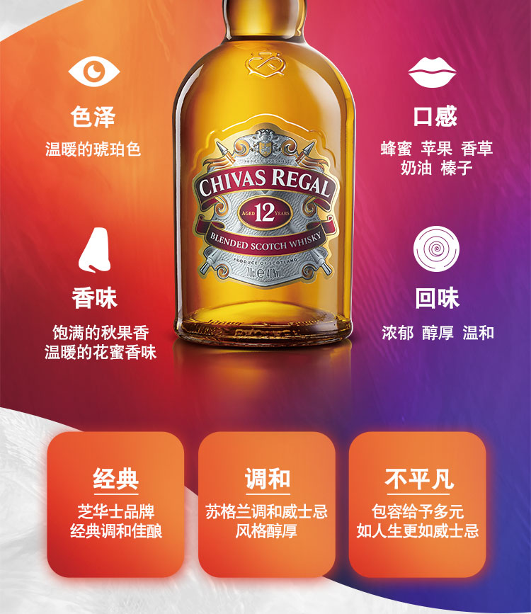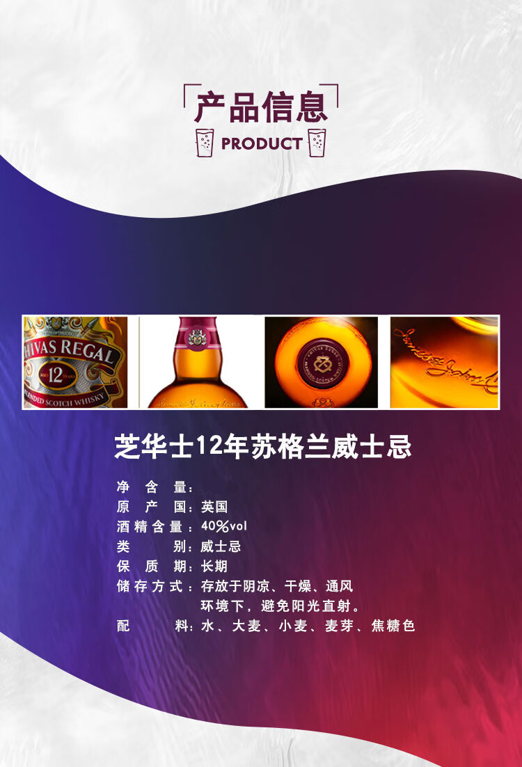 类型:调和威士忌;产地:苏格兰;适用场景:自斟自饮,亲友馈赠,家庭聚会,情侣约会,闺蜜私语;包装:瓶装;容量:500-699mL;阶段:小白入门;原料:水、大麦、小麦、麦芽;保质期:长期;酒精度:40%vol;存储方法:常温避光;产品重量:2.74kg;容量:500mL;包装清单:芝华士12年500ml+百龄坛特醇500ml 洋酒 苏格兰 威士忌 套装*1;