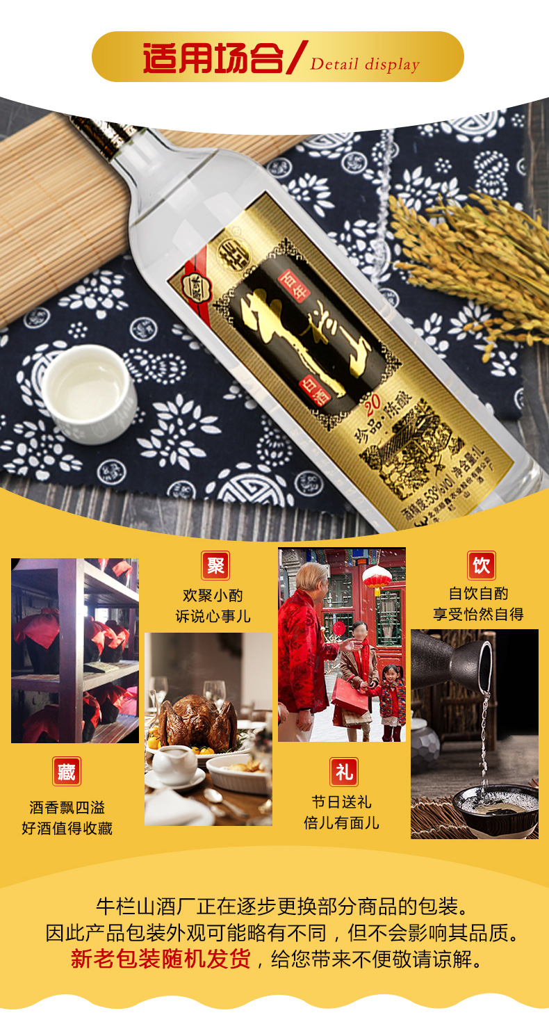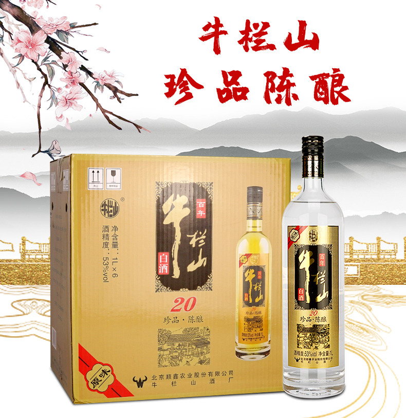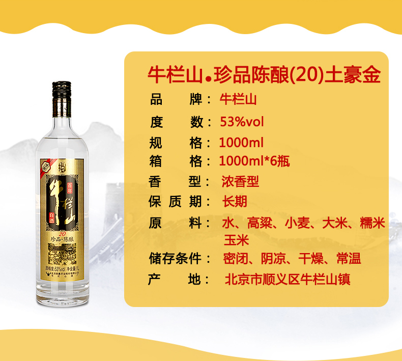 包装:整箱装;容量:750mL及以上;香型:浓香型;度数:50度及以上;香型:浓香型;产地:北京;酒精度:53%vol;包装:整箱装;产品重量:11400g;容量:1000ml;包装清单:牛栏山 白酒 浓香型 二锅头 原味 黑标 珍品陈酿(20)土豪金 53度 1000ml*6瓶 整箱装;