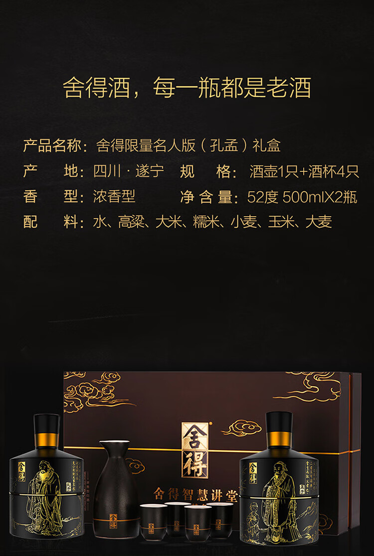 包装:礼盒装;容量:500-749mL;香型:浓香型;产地:四川;度数:50度及以上;酒精度:52%vol;容量:500ml*2;产品重量:3885g;包装清单:沱牌舍得 智慧舍得限量名人版礼盒装 52度 500ml*2 浓香型白酒;
