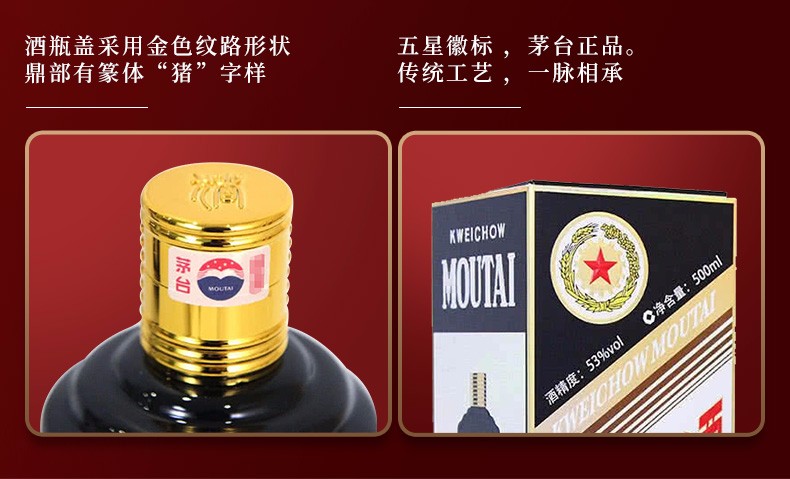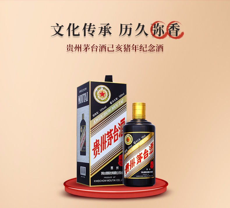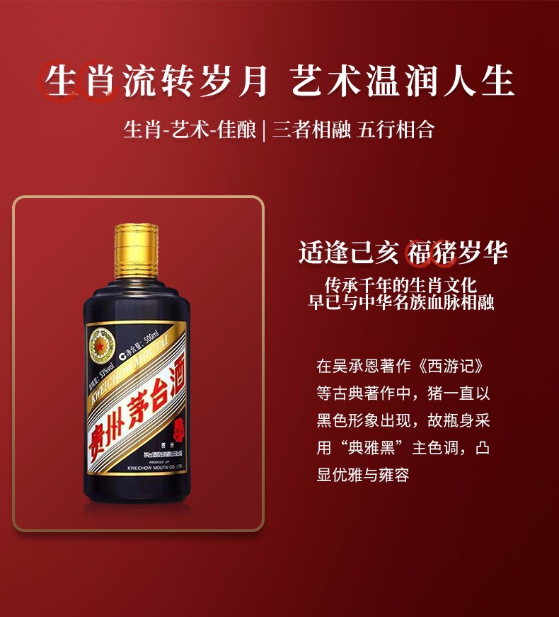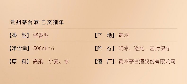 包装:瓶装;容量:500-749mL;香型:酱香型;产地:贵州;度数:50度及以上;酒精度:53%vol;容量:500ml;产品重量:500g;包装清单:53°贵州茅台酒(乙亥猪年)500ml*6瓶*1;