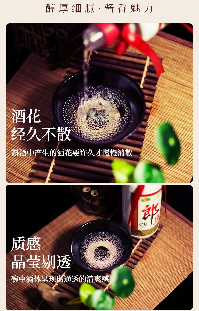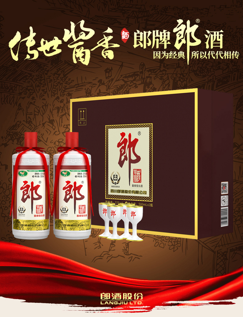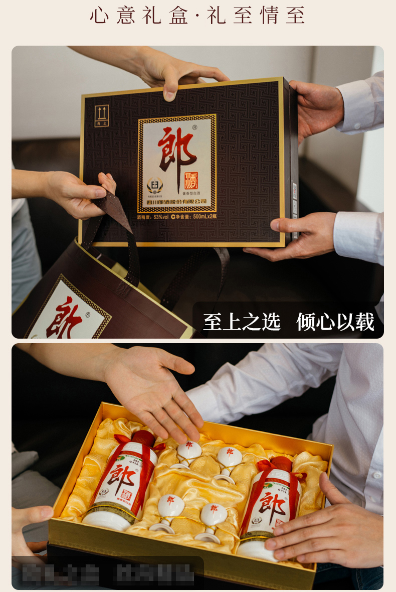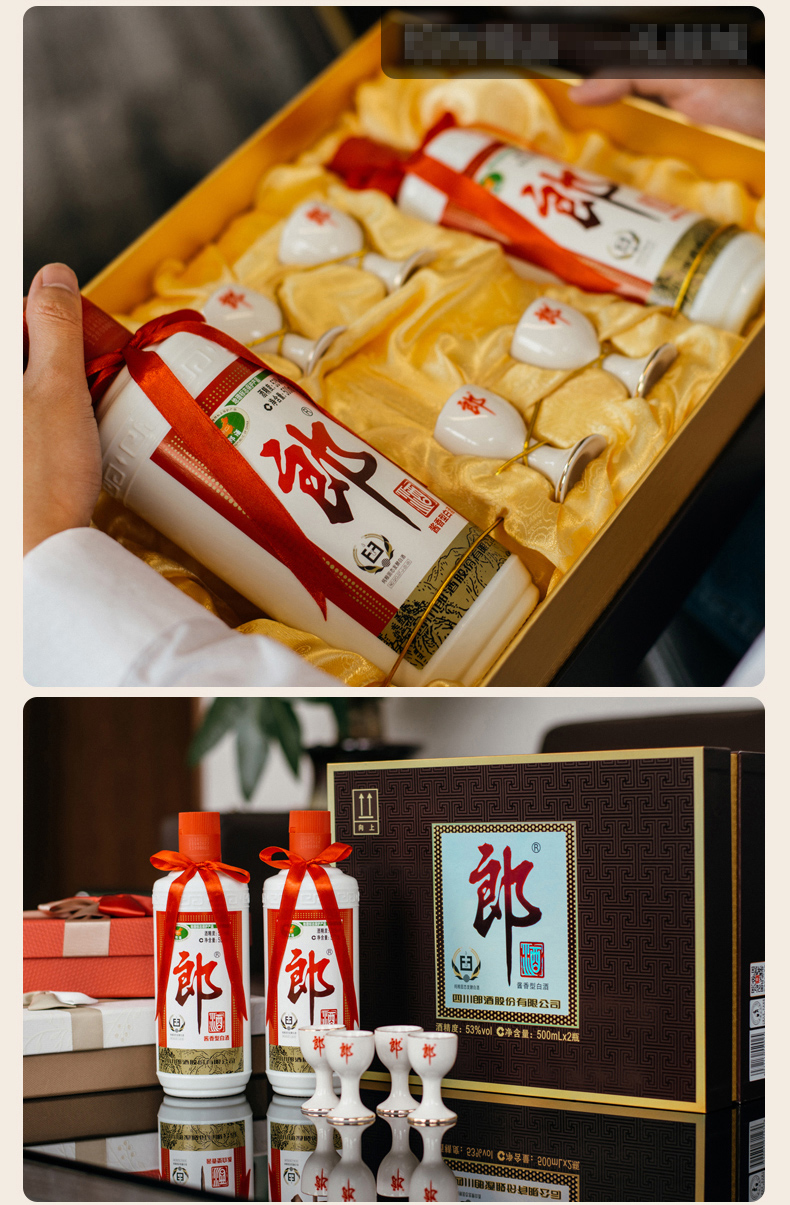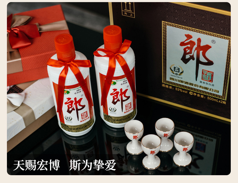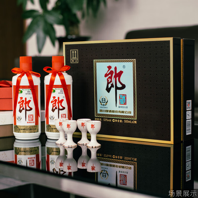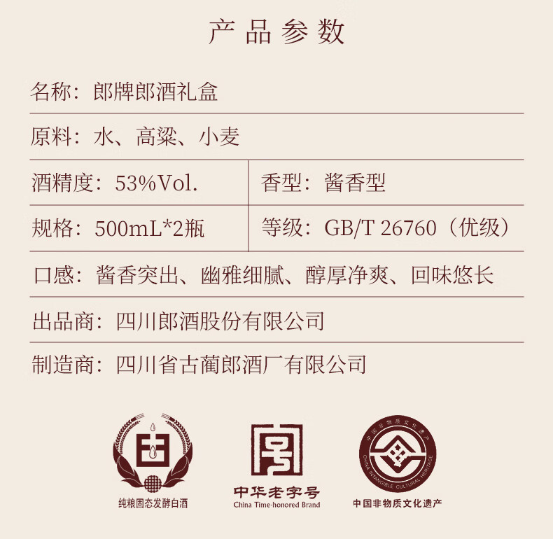 包装:礼盒装;容量:376-499mL;香型:酱香型;产地:四川;度数:50度及以上;酒精度:53%vol;容量:500ml;产品重量:3000g;包装清单:郎酒 郎牌郎酒 酱香型白酒 礼盒装 53度500ml*2瓶;
