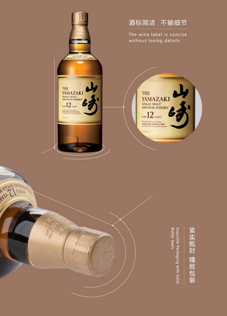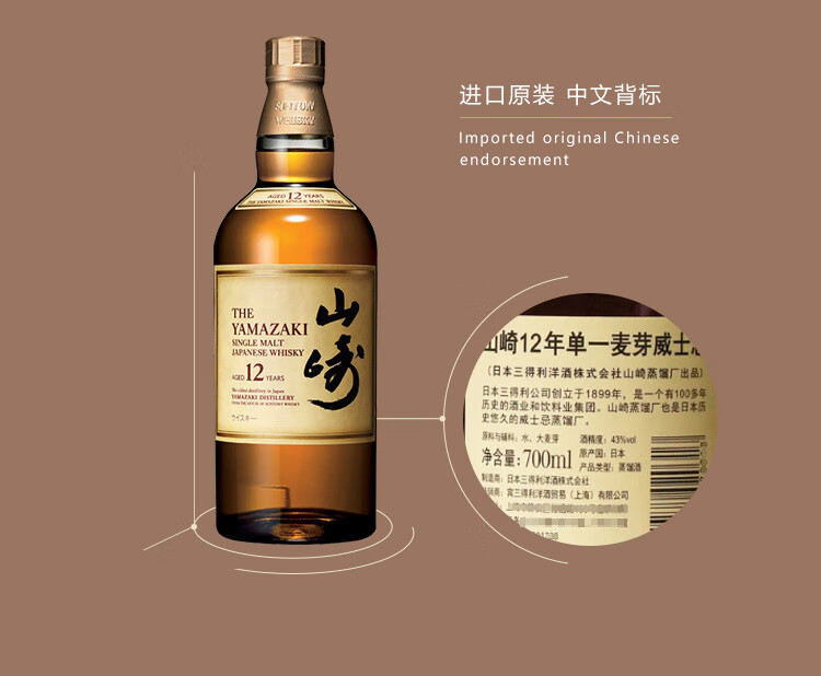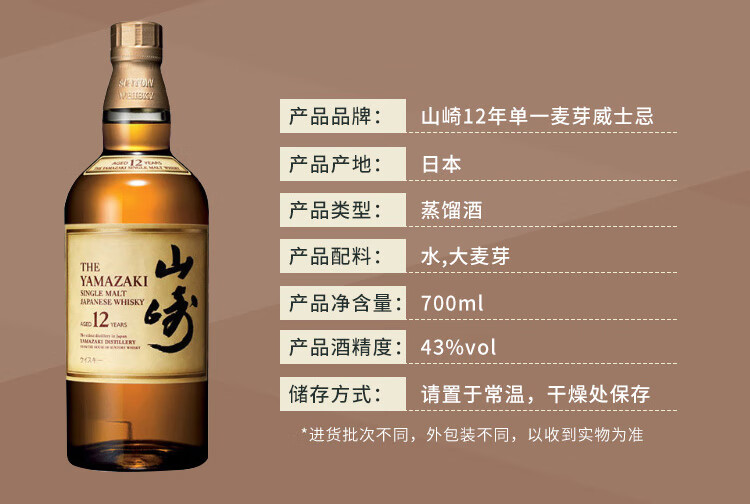 类型:单一麦芽威士忌;产地:日本;适用场景:情侣约会,闺蜜私语,自斟自饮,亲友馈赠,家庭聚会,商务宴请;包装:瓶装;容量:700-999mL;阶段:进阶优选;原料:水、大麦芽;保质期:长期;酒精度:43%vol;存储方法:放置于干燥阴凉处,避免阳光直射;产品重量:1.1kg;容量:700mL;包装清单:三得利(Suntory)威士忌 日本进口洋酒 山崎12年单一麦芽威士忌 700ml*1;