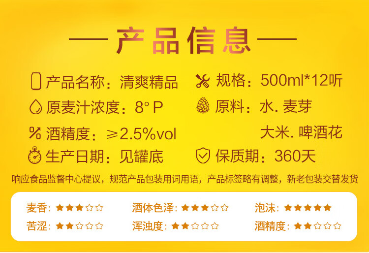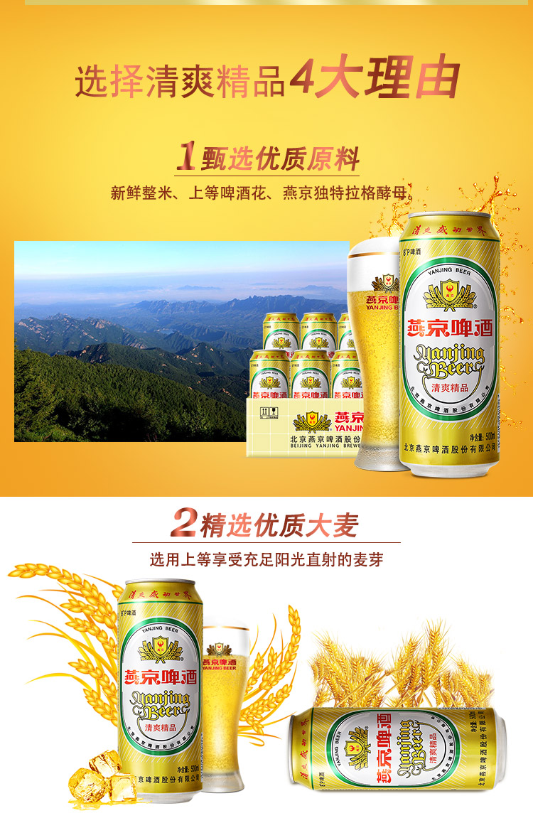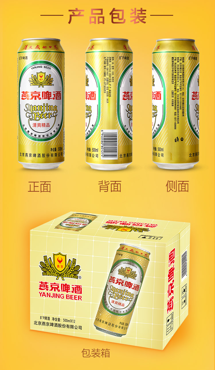 国产/进口:国产;产地:中国大陆;适用场景:野餐出游,礼节拜访,家庭聚会,自斟自饮,情侣约会,烧烤撸串,派对必备,酒吧夜店;包装:听装;容量:500mL;类别:黄啤酒;原料:水,麦芽,大米,啤酒花;保质期:360天;酒精度:≥2.5%vol;原产地:中国大陆;原麦汁浓度:8°P;存储方法:5℃-25℃, 避光贮运;容量:500ml;产品重量:6.5kg;包装清单:燕京啤酒 8度 清爽精品啤酒500ml*12听整箱装 金罐;