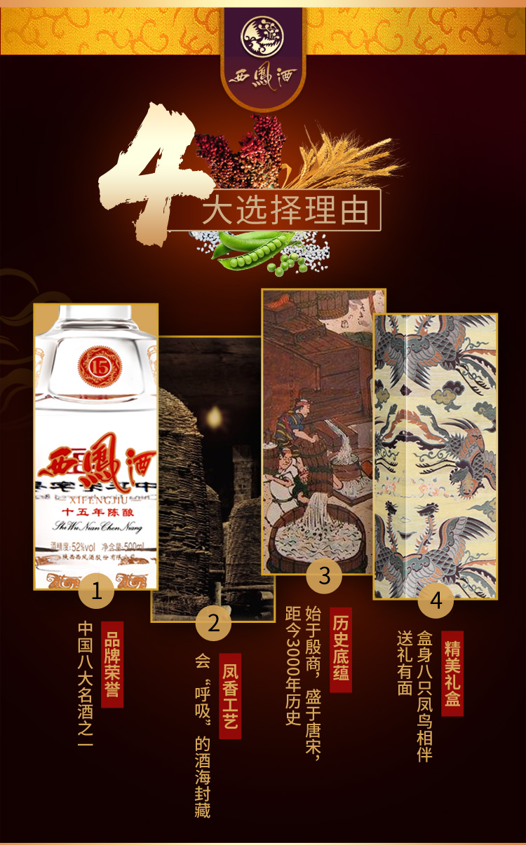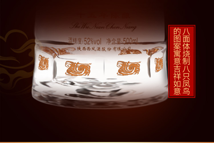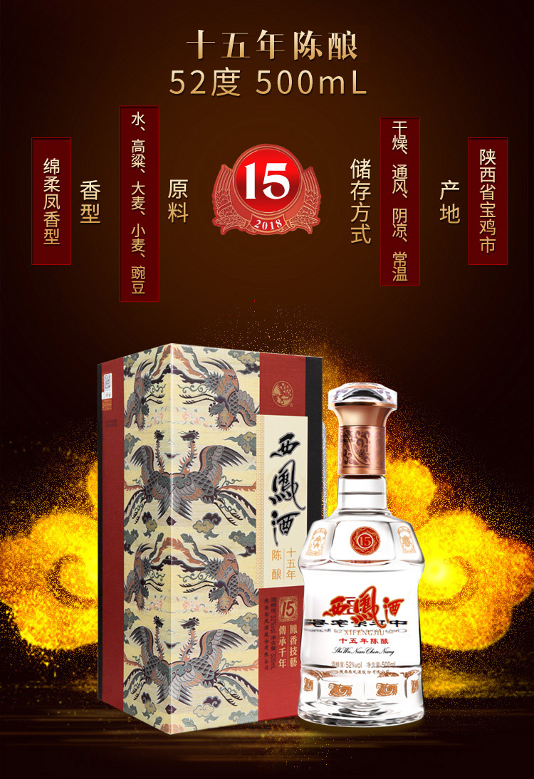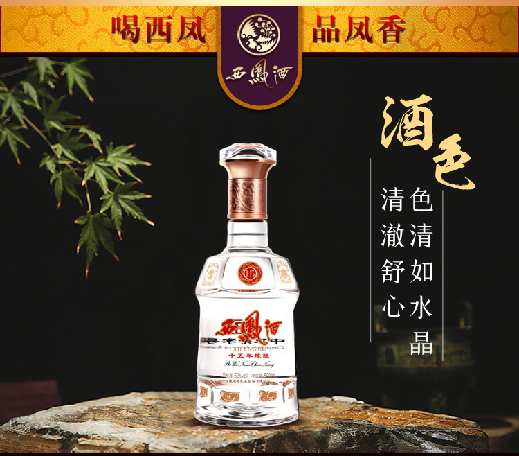 包装:瓶装;容量:500-749mL;香型:凤香型;产地:陕西;度数:50度及以上;酒精度:52%vol;容量:500ml;产品重量:1000g;包装清单:西凤酒 15年 十五年陈酿 52度 500ml*6瓶 口感凤香型 整箱装白酒;