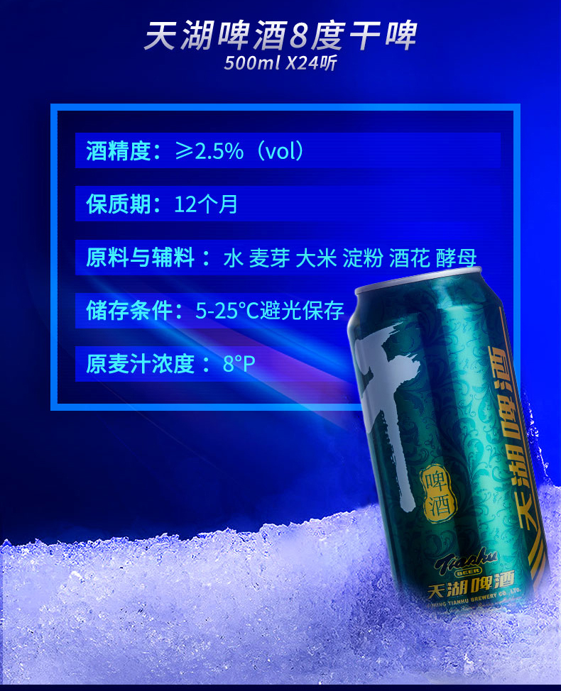国产/进口:国产;产地:中国大陆;适用场景:野餐出游,礼节拜访,家庭聚会,自斟自饮,情侣约会,烧烤撸串,派对必备,酒吧夜店;包装:听装;容量:500mL;类别:黄啤酒;原料:水、麦芽、淀粉、酒花、酵母;保质期:365天;酒精度:≥2.5%(vol);原产地:中国大陆;原麦汁浓度:8;存储方法:5-25度避光;产品重量:13kg;容量:500;包装清单:天湖啤酒8度干啤酒 500ml*24听 整箱装 水库深层水酿造;