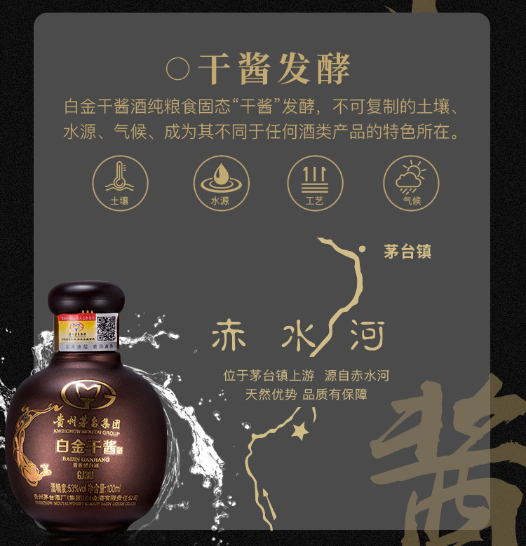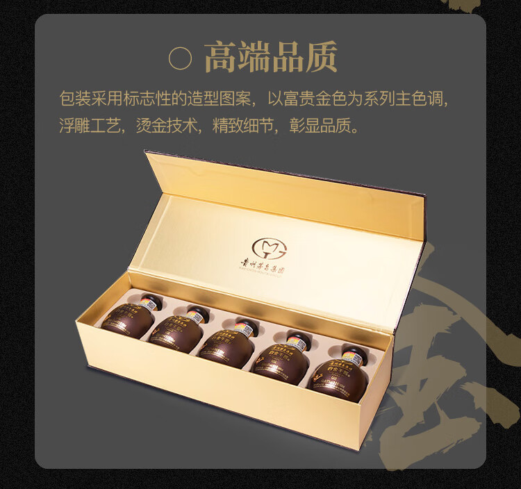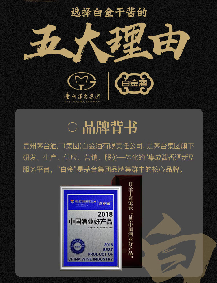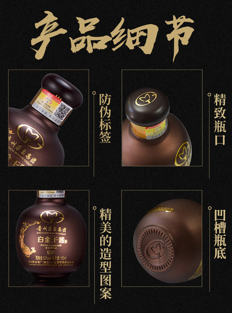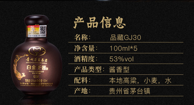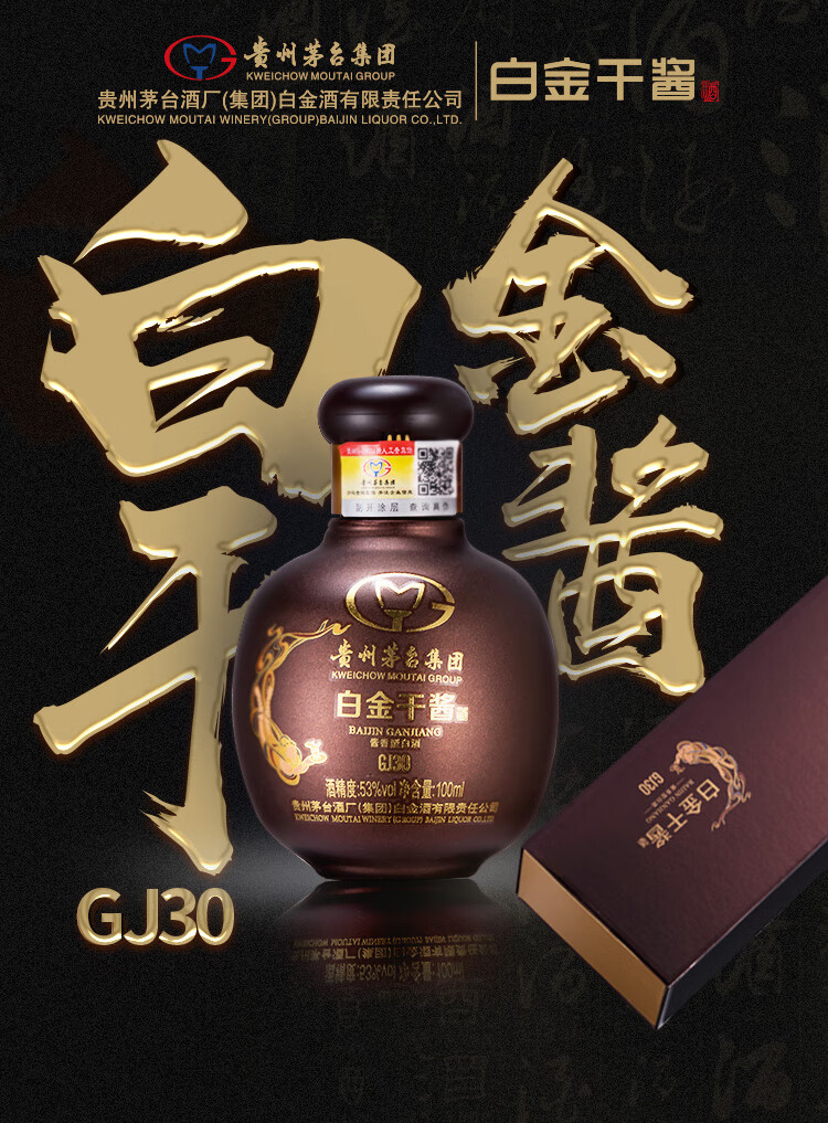 包装:其它;容量:500-749mL;香型:酱香型;产地:贵州;度数:50度及以上;酒精度:53%vol;容量:500-749mL;产品重量:2.05g;包装清单:茅台 集团 白金酒 公司 白金干酱 品藏GJ30 酒 53度 酱香型 白酒 单条 100ml*5 礼盒装*1;