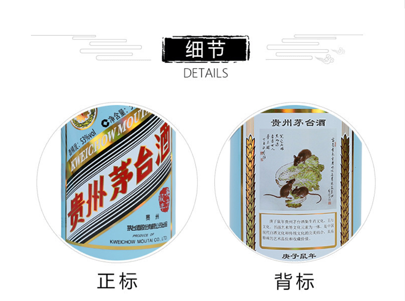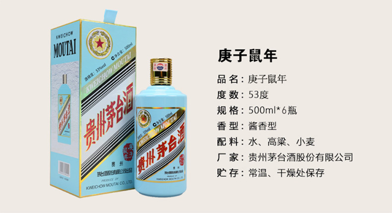 包装:瓶装;容量:500-749mL;香型:酱香型;产地:贵州;度数:50度及以上;酒精度:53%vol;容量:500ml;产品重量:6000g;包装清单:53°贵州茅台酒(庚子鼠年)500ml*6瓶*1;
