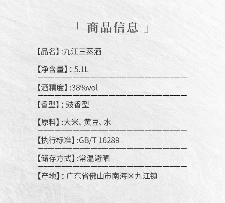 包装:桶装;容量:750mL及以上;香型:其它;产地:广东;度数:35-39度;酒精度:38%vol;容量:5.1L;产品重量:7100g;包装清单:5.1L;