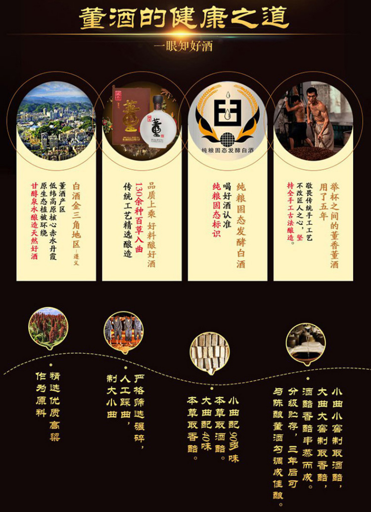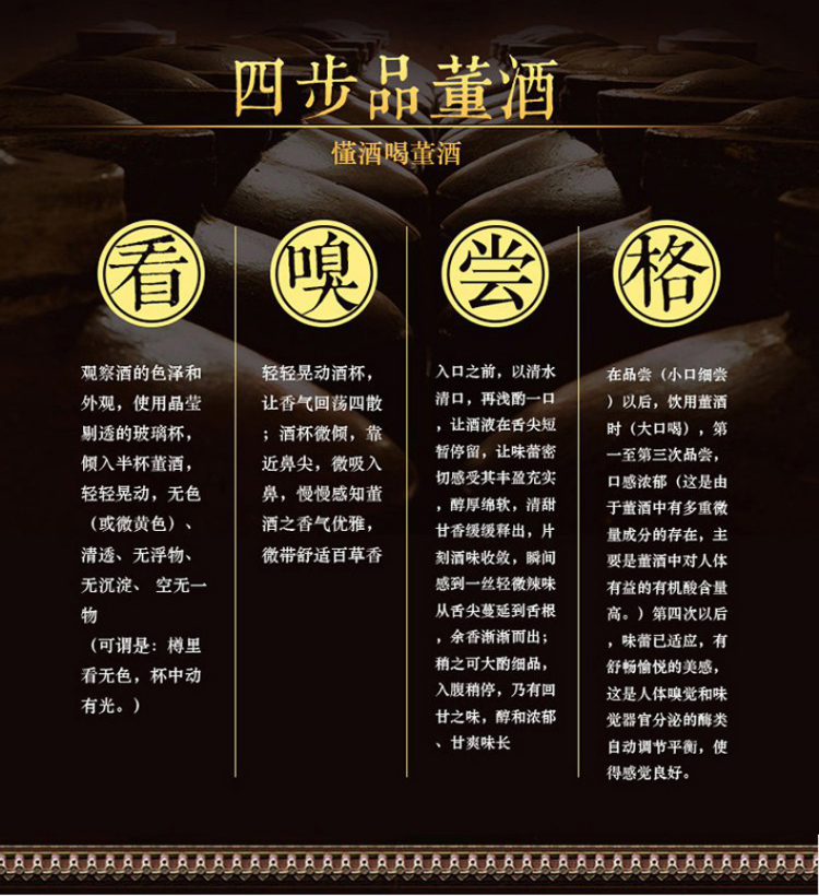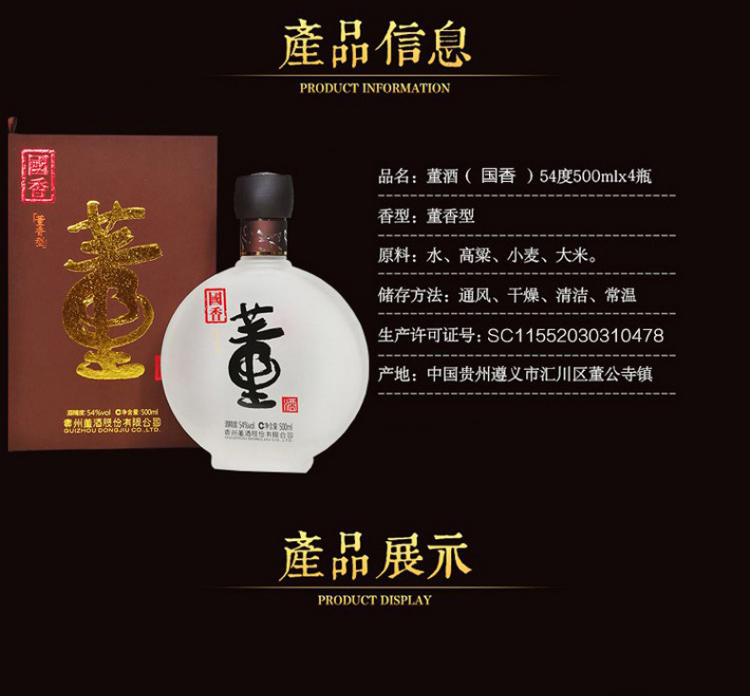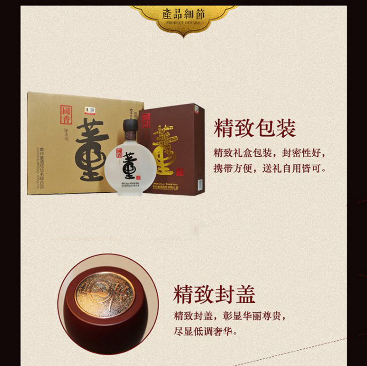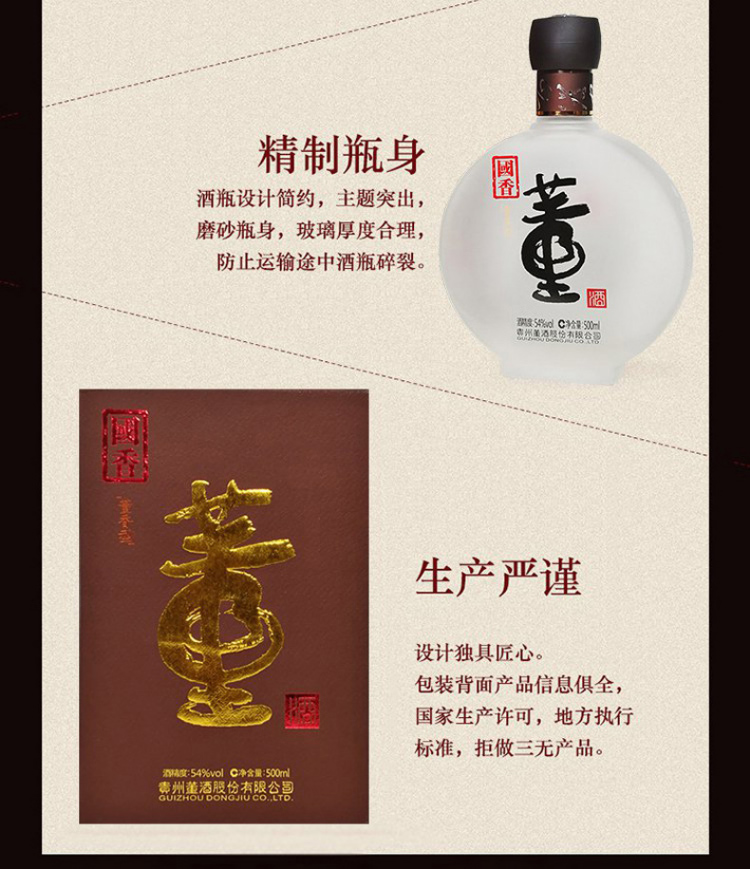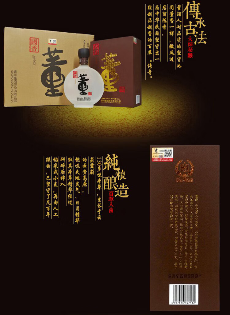 包装:整箱装;容量:376-499mL;香型:董香型;产地:贵州;度数:50度及以上;酒精度:54%vol;容量:500;产品重量:6.44g;包装清单:董酒 白酒 国香 董香型 54度 500ml*4瓶 整箱装*1;