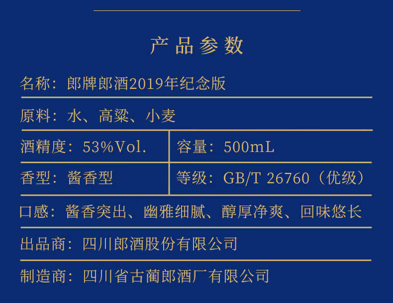 包装:瓶装;容量:500-749mL;香型:酱香型;度数:50度及以上;产地:四川泸州;酒精度:53%vol;容量:500ml;产品重量:1050g;包装清单:郎酒 盛世郎酒 53度 郎牌郎酒2019年纪念版 500mL*1瓶;