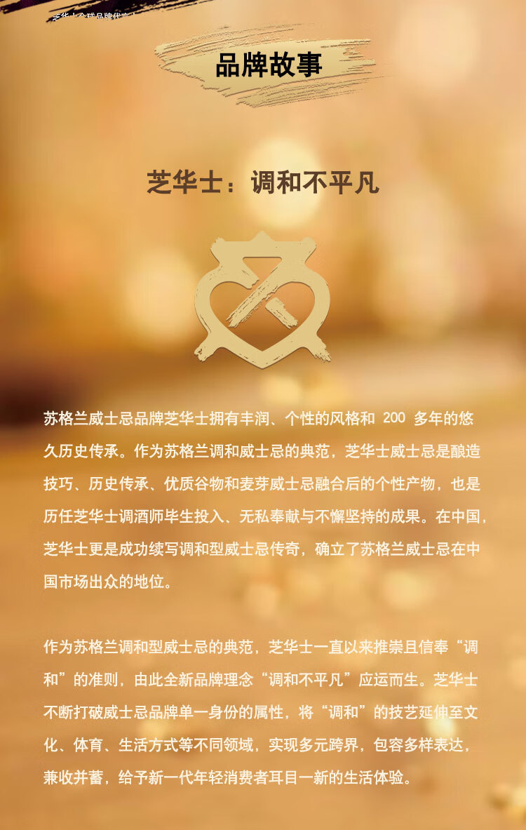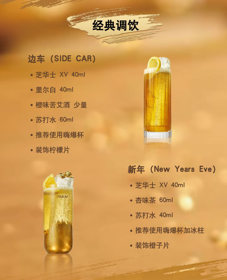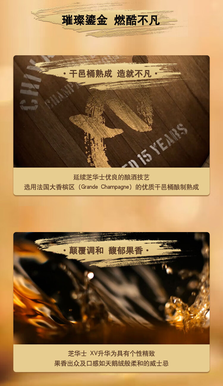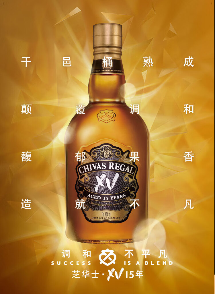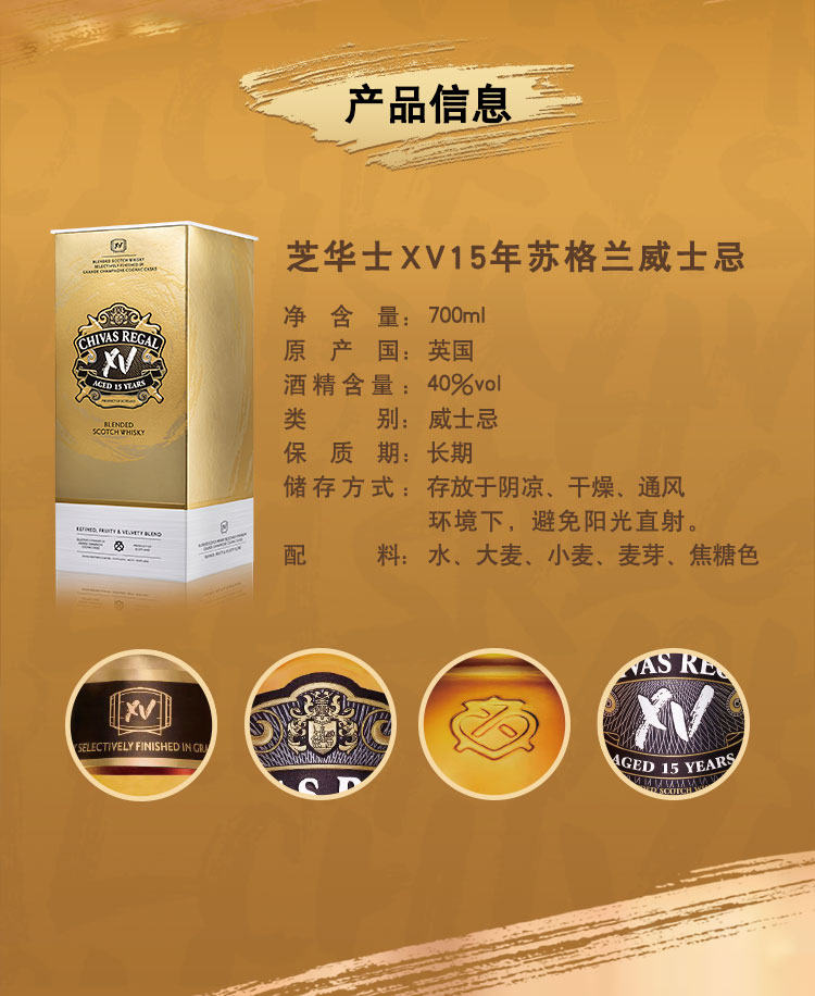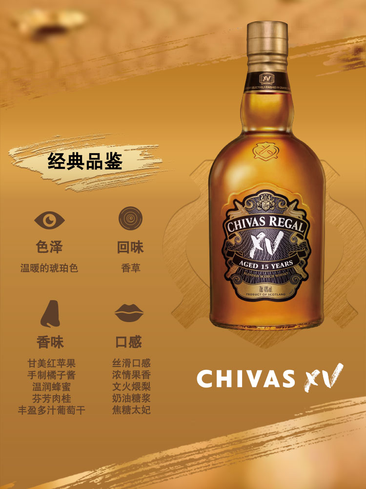 类型:调和威士忌;产地:苏格兰;适用场景:情侣约会,闺蜜私语,自斟自饮,亲友馈赠,家庭聚会,商务宴请;包装:瓶装;容量:700-999mL;阶段:挑剔味蕾;原料:水、大麦、小麦、麦芽;保质期:长期;酒精度:40%vol;存储方法:常温避光;产品重量:1.5kg;容量:700mL;包装清单:芝华士(Chivas)洋酒 苏格兰 威士忌 15年 XV 透金版 700ml *1;