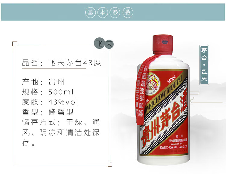 包装:瓶装;容量:500-749mL;香型:酱香型;产地:贵州;度数:40-49度;酒精度:43%vol;容量:500ml;产品重量:500g;包装清单:茅台 飞天 43度 500ml 单瓶装 酱香型白酒*1;