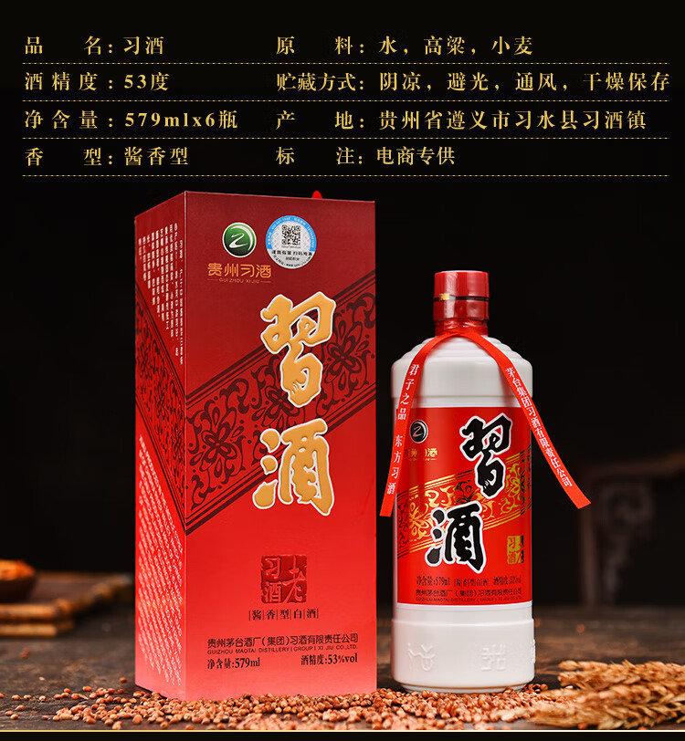 包装:整箱装;容量:500-749mL;香型:酱香型;产地:贵州;度数:50度及以上;酒精度:53%vol;容量:579;产品重量:12000g;包装清单:习酒 老习酒 53度 酱香型白酒 579ml*6瓶 整箱装*1;