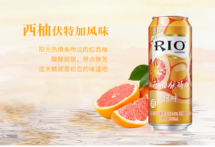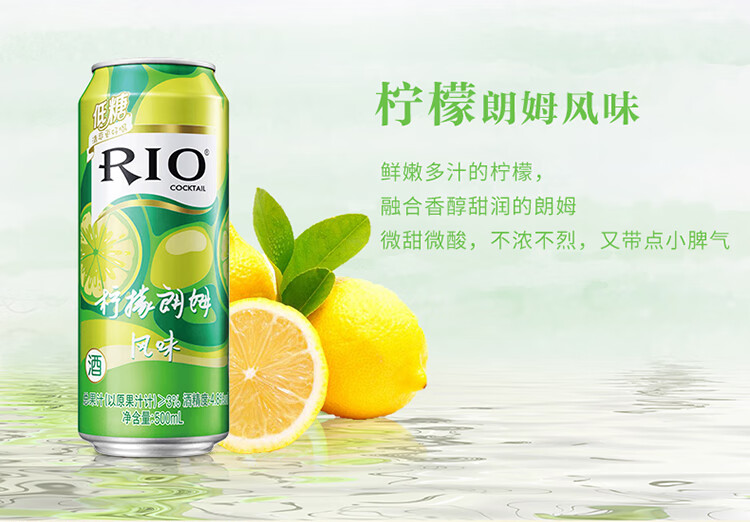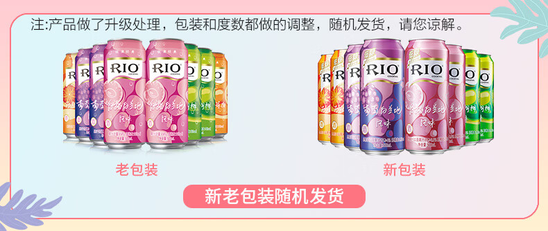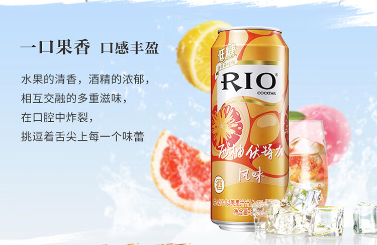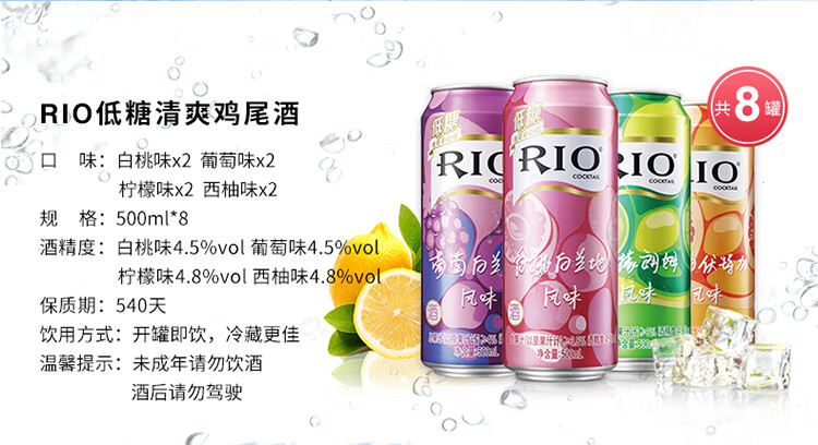 国产/进口:国产;产地:中国大陆;适用场景:商务宴请,家庭聚会,闺蜜私语,亲友馈赠,自斟自饮,情侣约会;包装:其它;容量:500-699mL;原料:水、白砂糖、果葡糖浆、食品添加剂、食用香精等;保质期:540天;酒精度:4.5%vol;存储方法:请置于阴凉干燥处,避免高温和阳光直晒,禁止加热或0℃以下冷冻,切勿撞击。;容量:500mL;产品重量:4.2kg;包装清单:锐澳(RIO)洋酒 预调 鸡尾酒 果酒 清爽系列 500ml*8罐(4种口味);