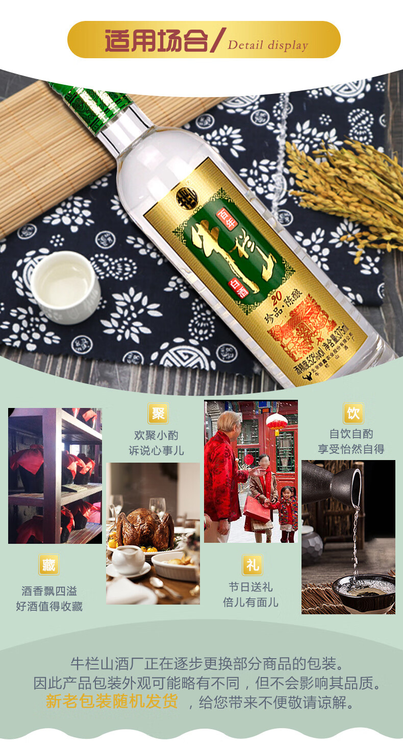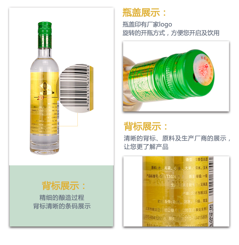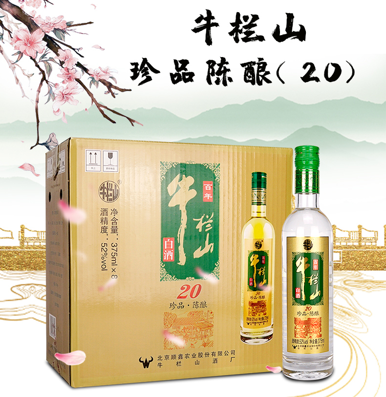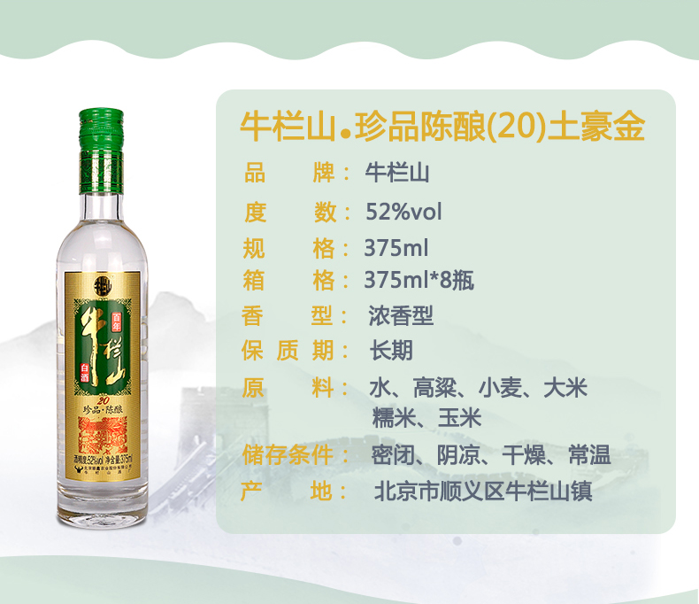 包装:整箱装;容量:375mL及以下;香型:浓香型;度数:50度及以上;香型:浓香型;产地:北京;酒精度:52%vol;包装:整箱装;产品重量:6900g;容量:375ml;包装清单:牛栏山 白酒 浓香型 二锅头 珍品陈酿(20)土豪金 52度 375ml*8瓶 整箱装;