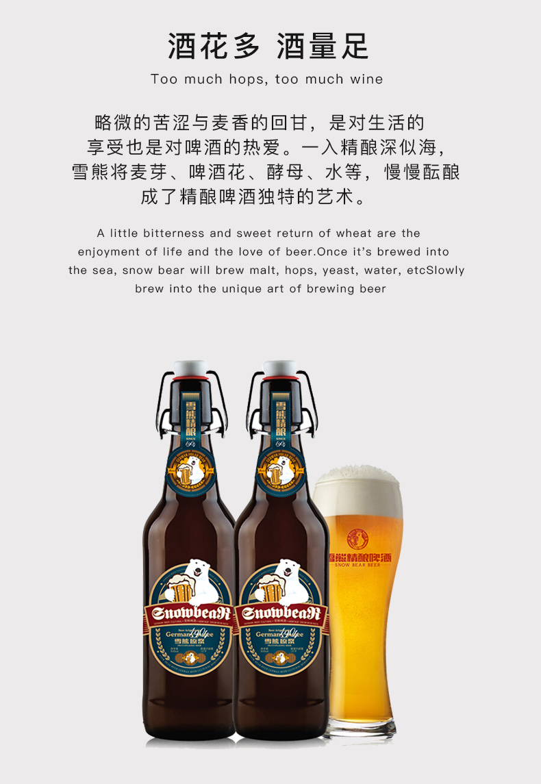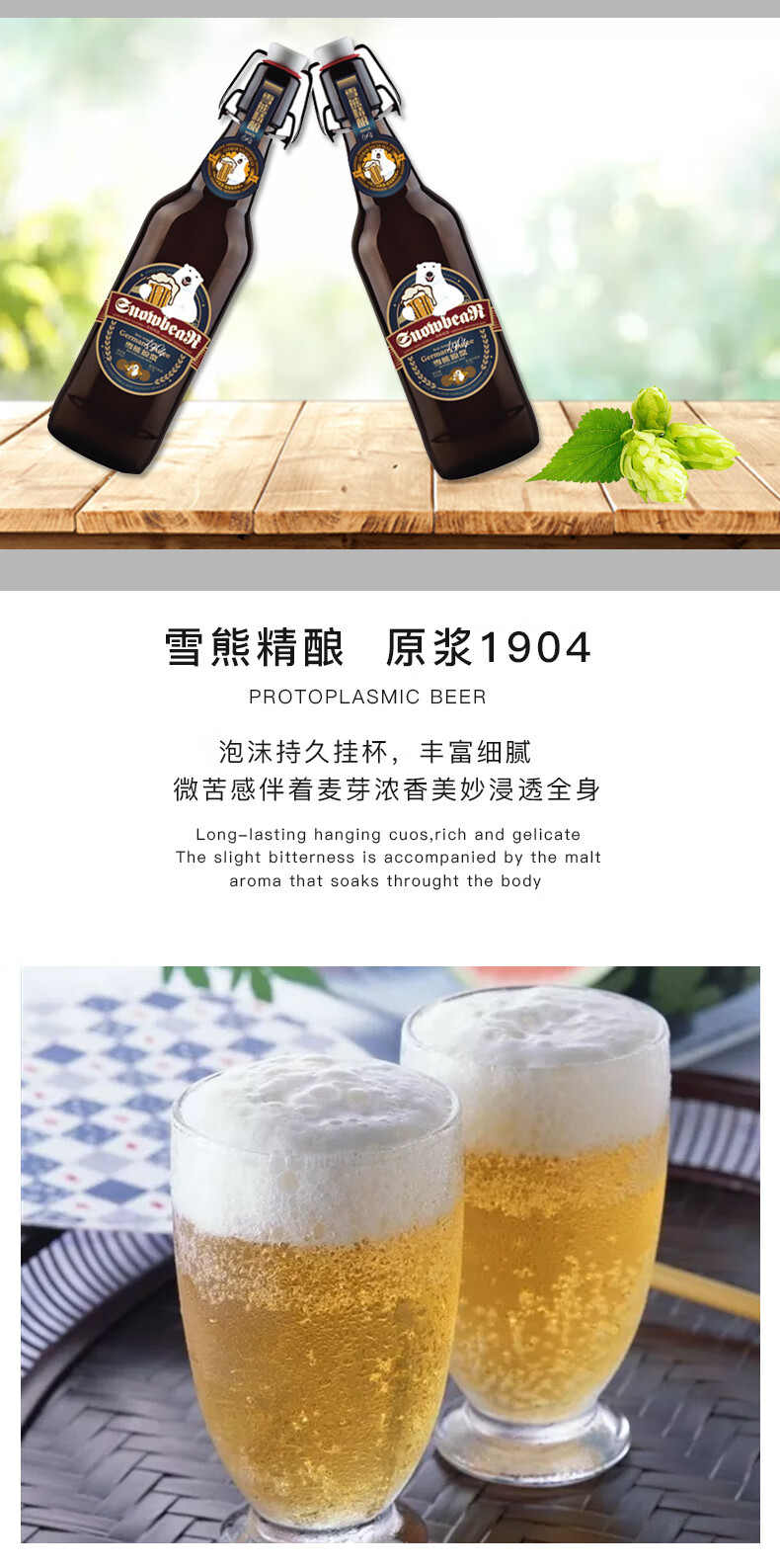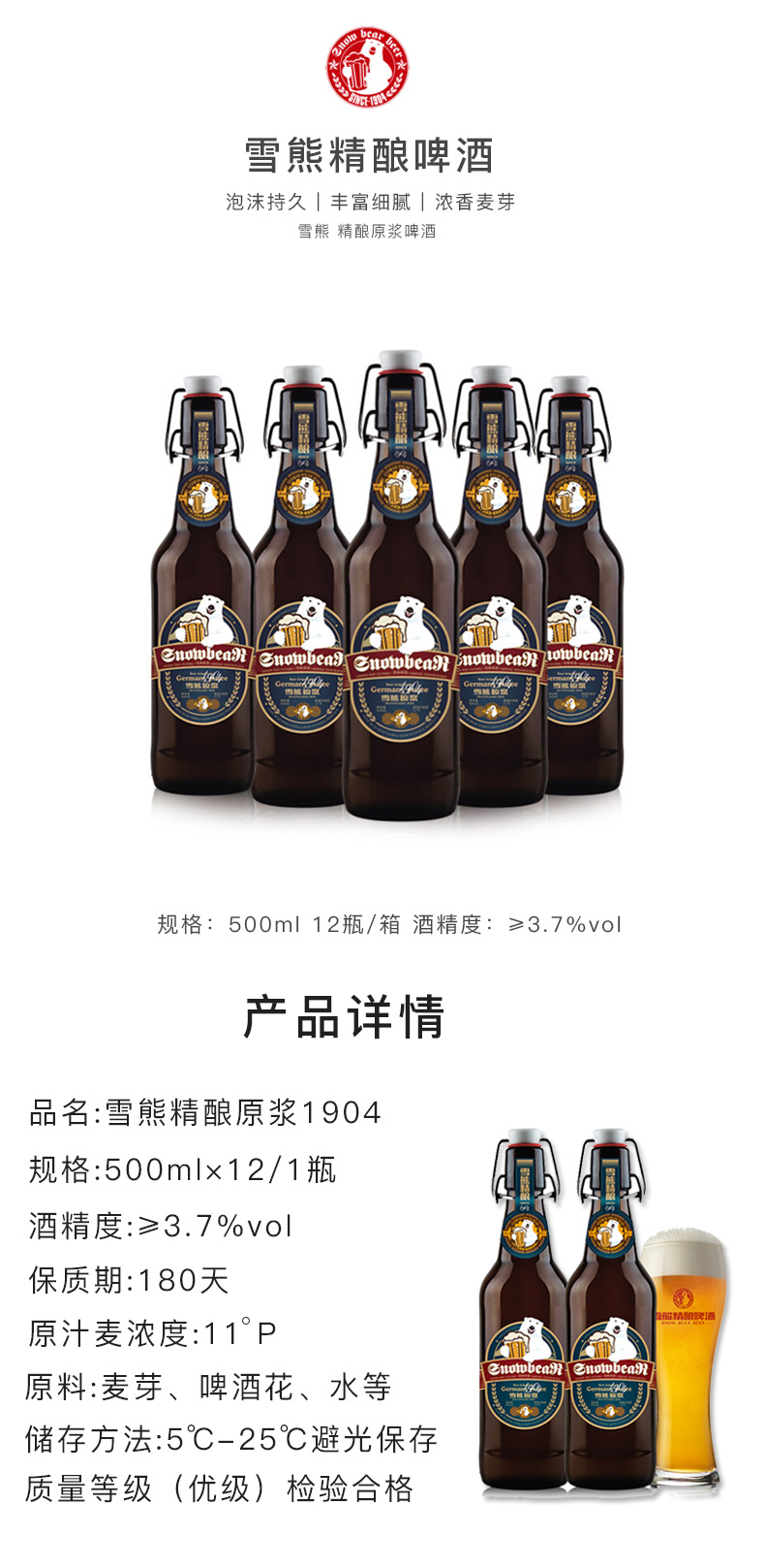 国产/进口:国产;产地:中国大陆;适用场景:家庭聚会,礼节拜访,情侣约会,自斟自饮,派对必备,烧烤撸串,酒吧夜店,野餐出游;包装:瓶装;容量:500mL;类别:原浆啤酒;原料:麦芽、啤酒花、水和酵母;保质期:180;酒精度:≥3.7%vol;原产地:中国大陆;原麦汁浓度:11°P;存储方法:阴凉干燥处;产品重量:11.8kg;容量:500ml*12瓶;包装清单:雪熊啤酒 雪熊精酿·原浆1904 500ml*12瓶;