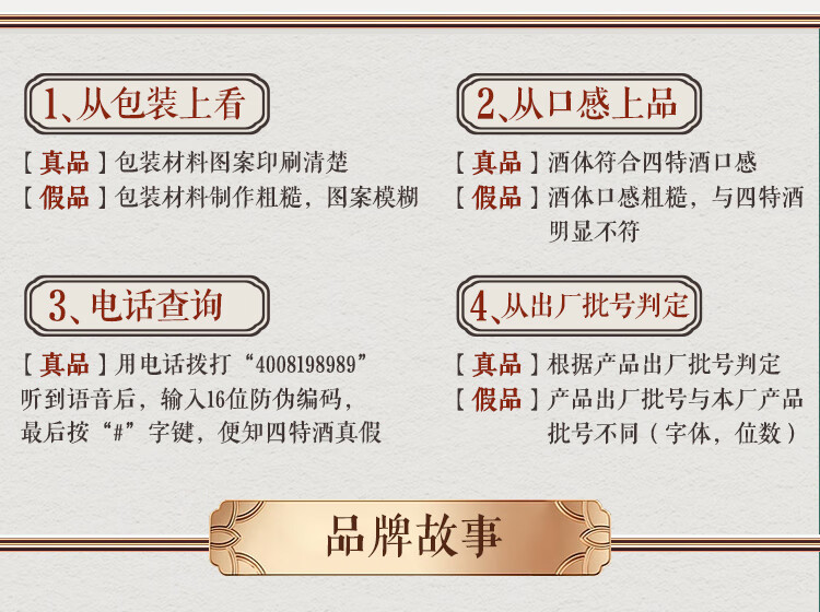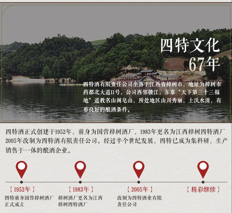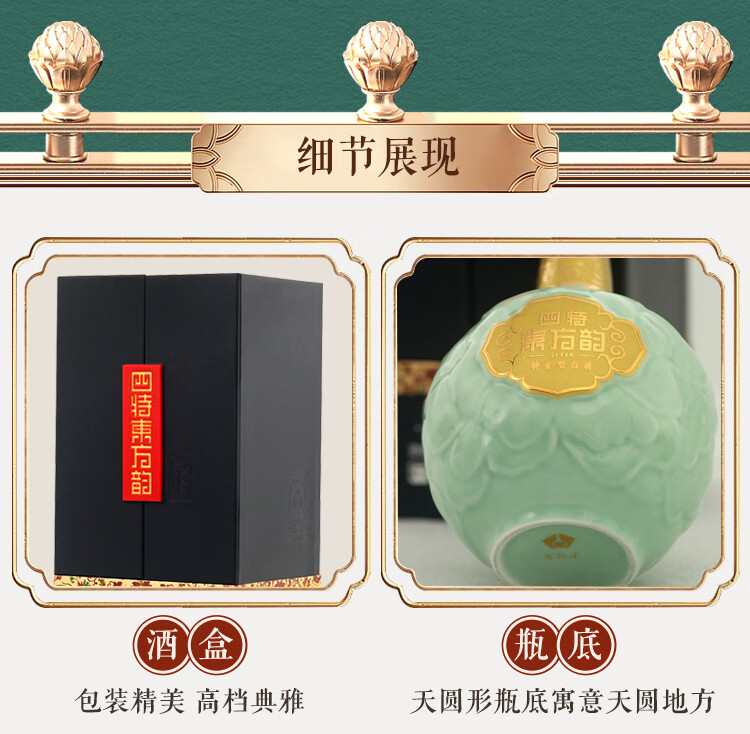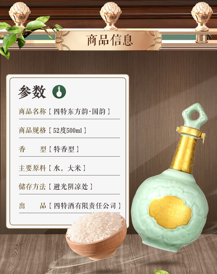包装:瓶装;容量:376-499mL;香型:特香型;产地:江西;度数:50度及以上;酒精度:52%vol;容量:500ml;产品重量:1730g;包装清单:四特酒东方韵国韵52度 500ml(新版包装) × 1;