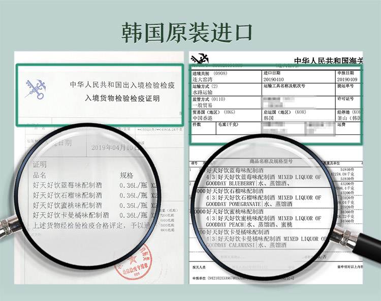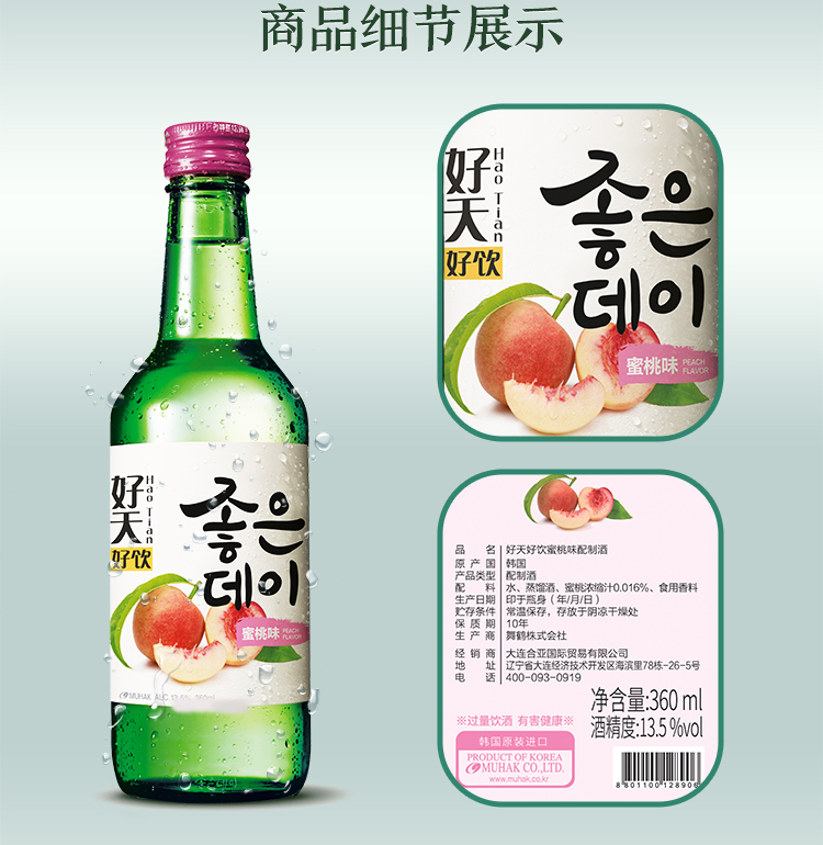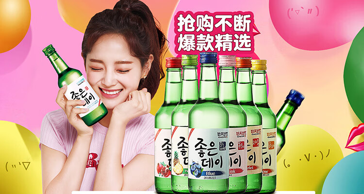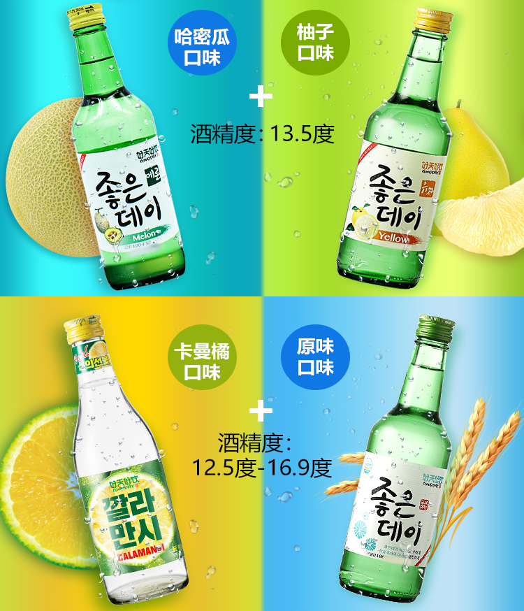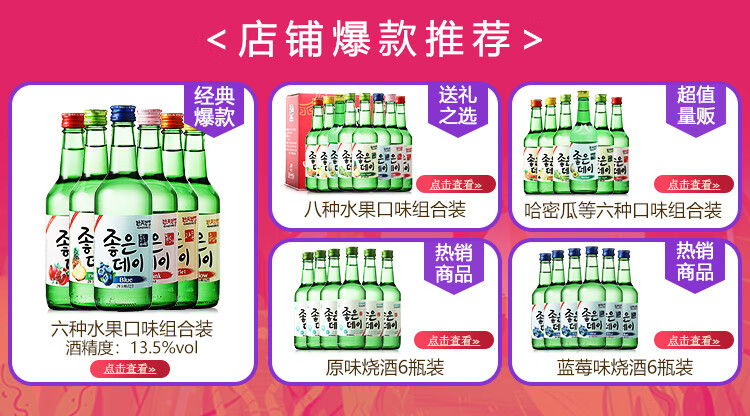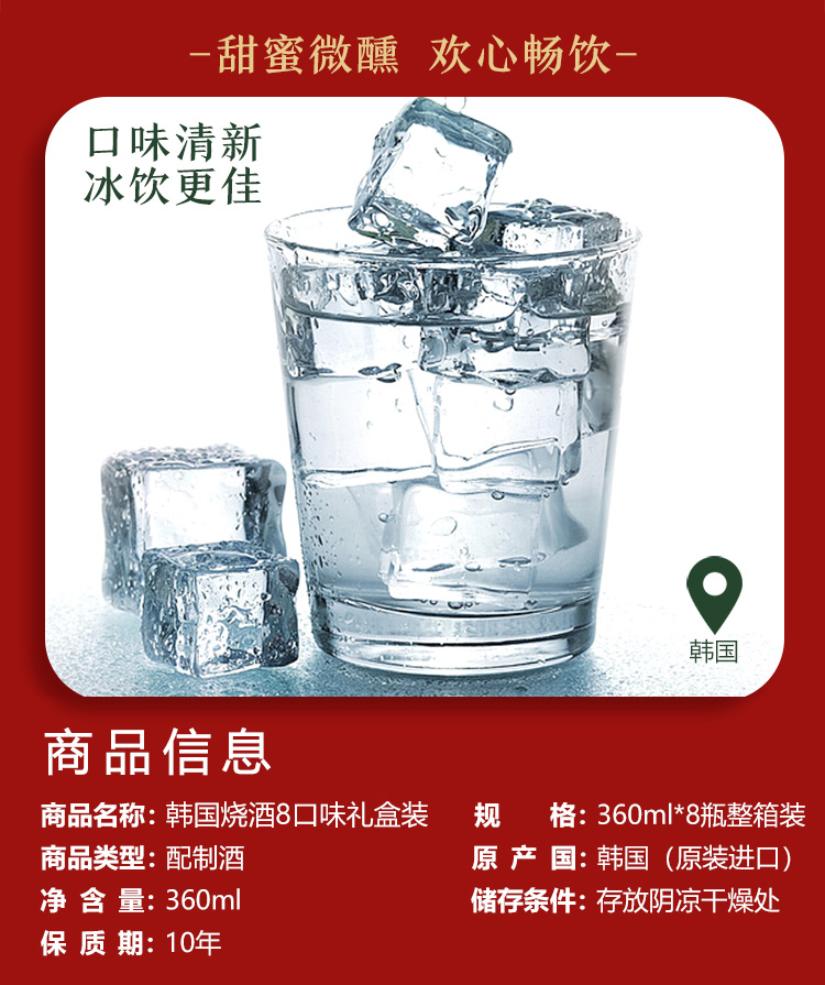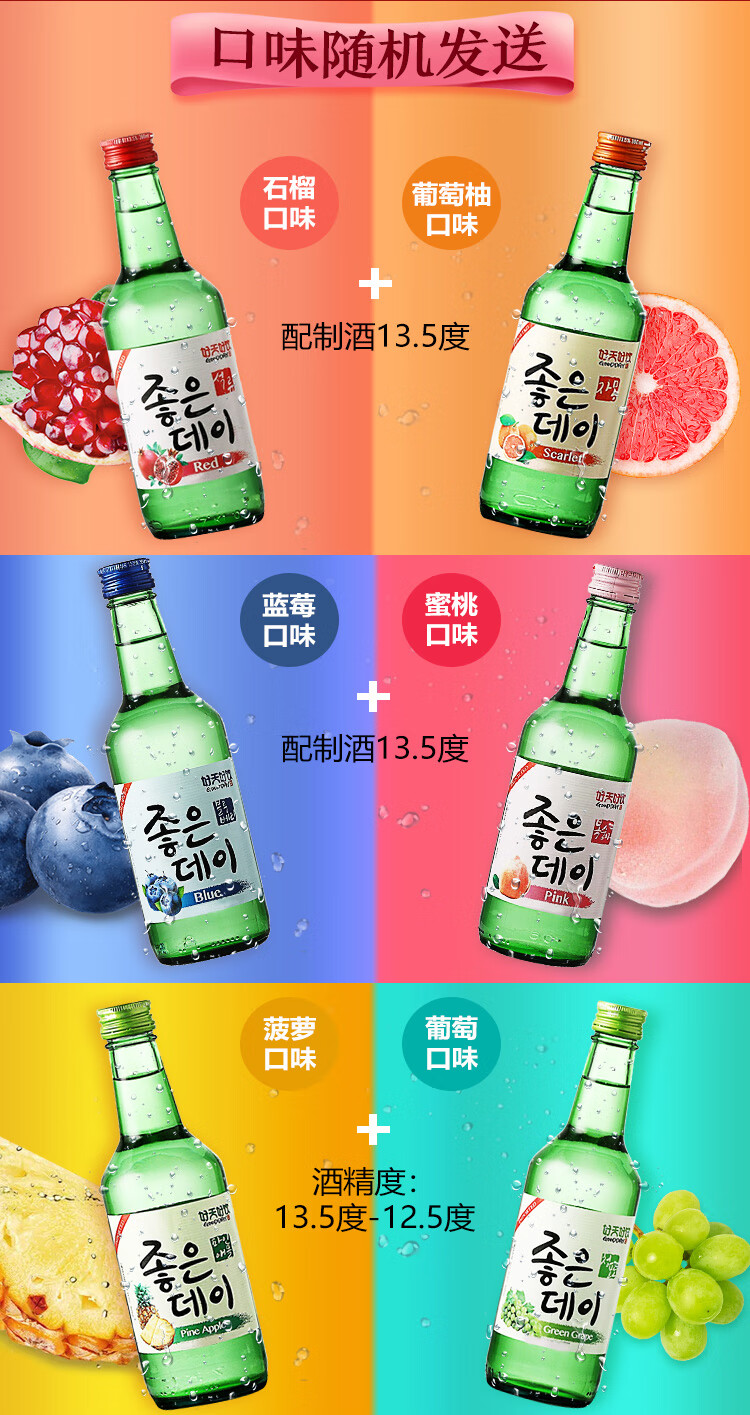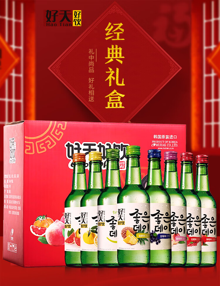 国产/进口:进口;产地:韩国;适用场景:家庭聚会,商务宴请,情侣约会,自斟自饮,亲友馈赠,闺蜜私语;包装:组合装;容量:200-374mL;原料:水、蒸馏酒、水果浓缩汁、食用香料;保质期:3650天;酒精度:13.5%vol;存储方法:常温保存,存放于阴凉干燥处;产品重量:5.6kg;容量:360mL;包装清单:好天好饮(GOODDAY )韩国烧酒原瓶进口 8种水果口味组合 360ml*8瓶整箱装 (口味随机发送);