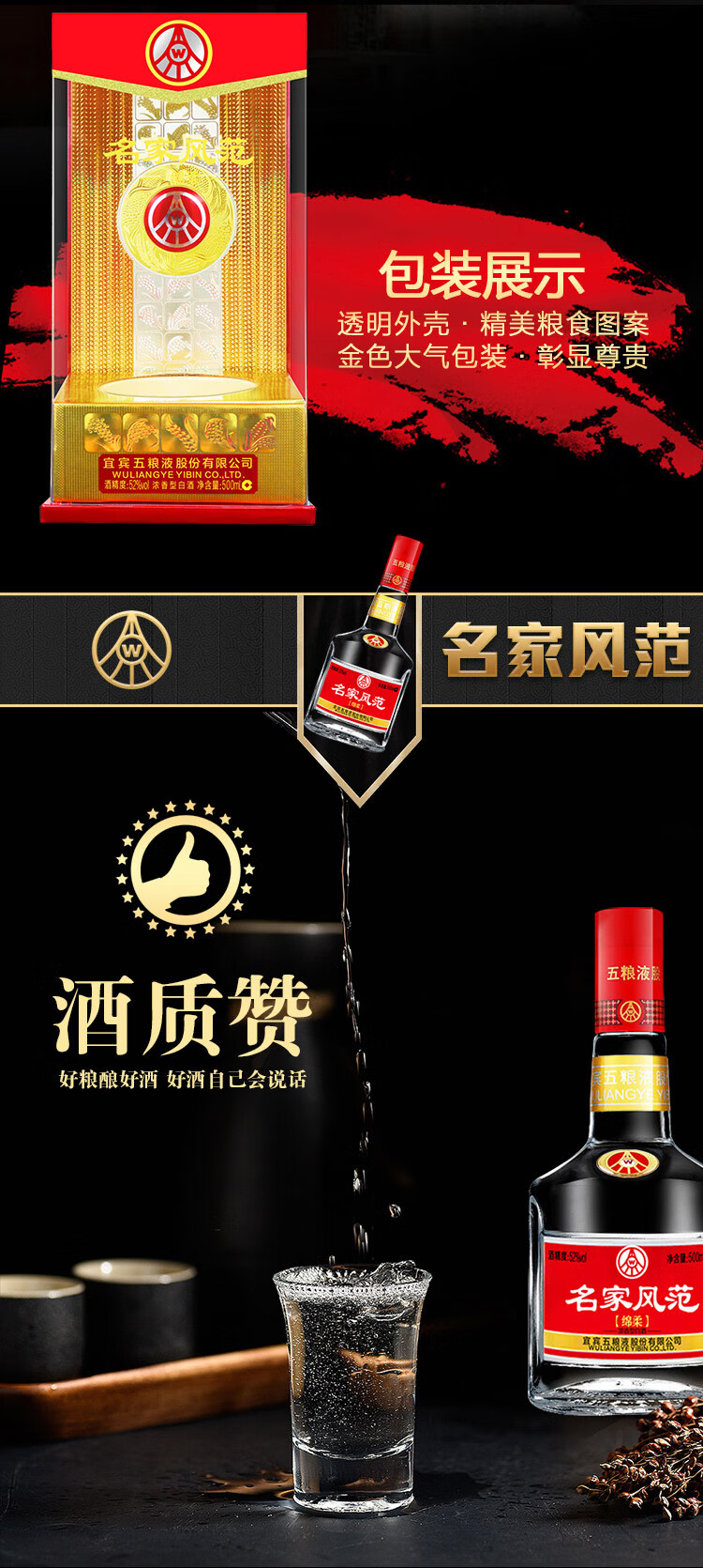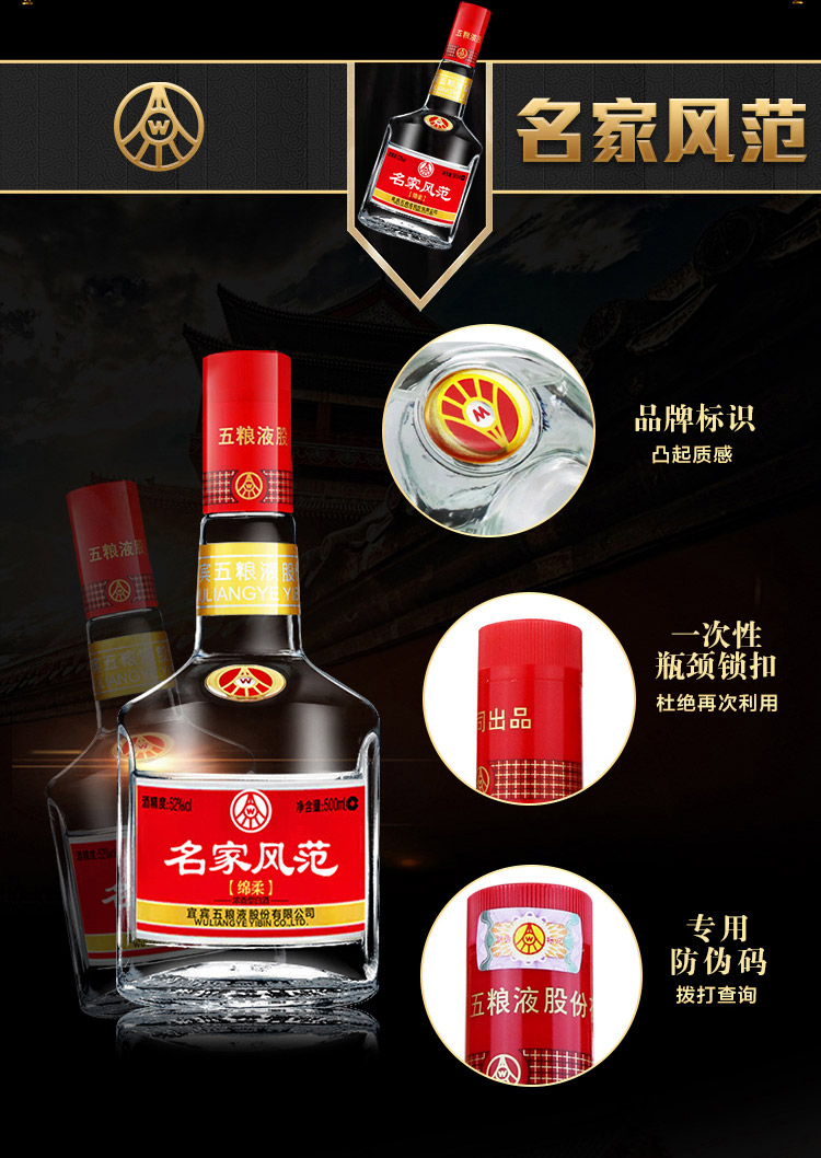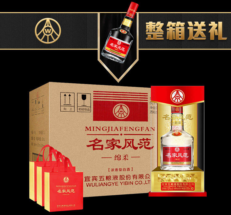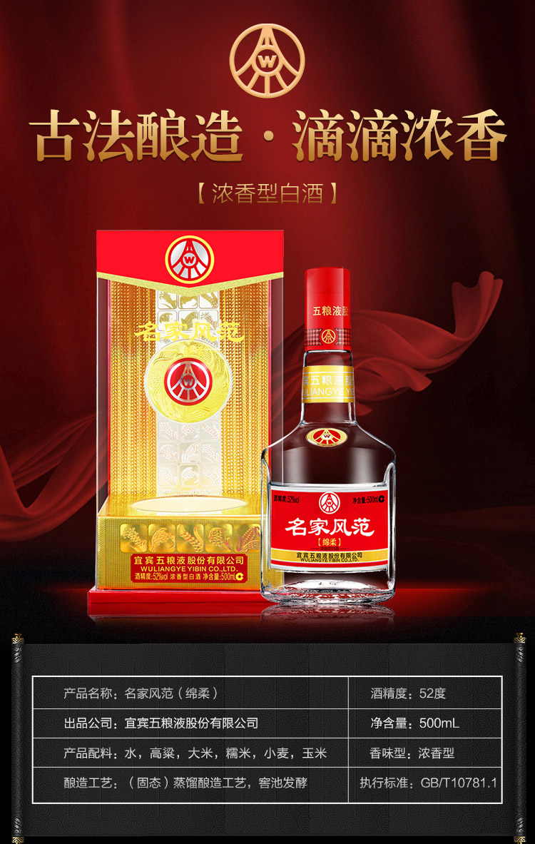 包装:整箱装;容量:500-749mL;香型:浓香型;产地:四川;度数:50度及以上;酒精度:52%vol;容量:500;产品重量:9060g;包装清单:名家风范绵柔 52度500ml*6瓶;