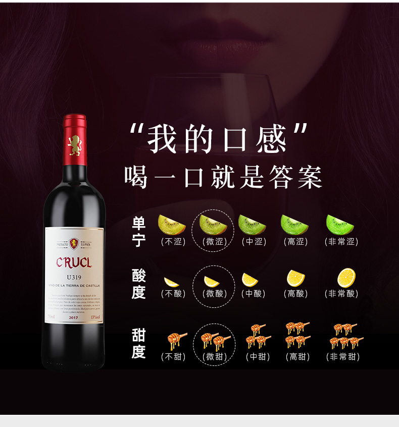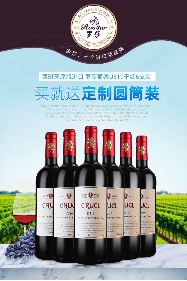 颜色:宝石红;采摘年份:2017年;口感:柔和;特性:普通餐酒;国产/进口:进口;适用场景:礼节拜访,商务宴请,婚礼婚宴,情侣约会,家庭聚会,收藏,自斟自饮,闺蜜私语,派对活动;包装:整箱装;酸度:低酸;类别:红葡萄酒;葡萄品种:其它;类型:静止酒;香型:花香,植物,果香;产地:西班牙;容量:376-749mL;甜度:干型;保质期:10年;酒精度:13%vol;原产地:西班牙;存储方法:常温避光卧放;容量:750ml;产品重量:9kg;包装清单:罗莎萄客U319*6;晨星山谷圆筒礼盒*6;