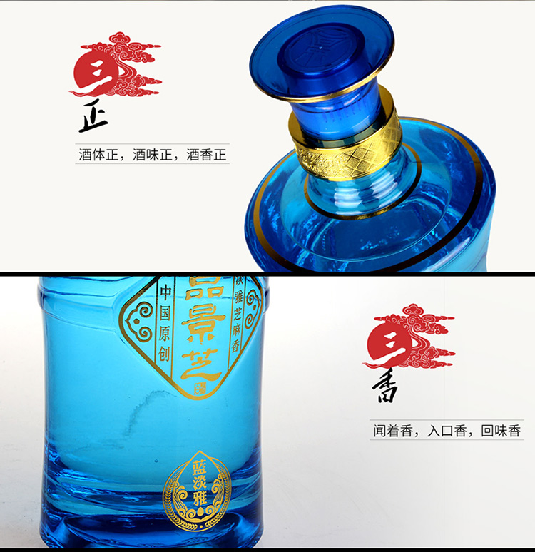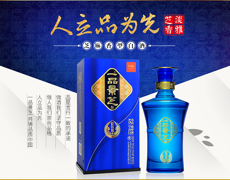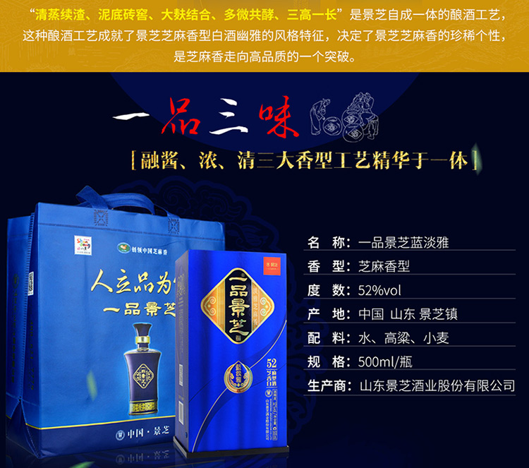 包装:整箱装;容量:500-749mL;香型:芝麻香型;产地:山东;度数:50度及以上;酒精度:52%vol;容量:500ml;产品重量:6000g;包装清单:景芝 一品景芝 蓝淡雅52度 500ml*6整箱 *1;