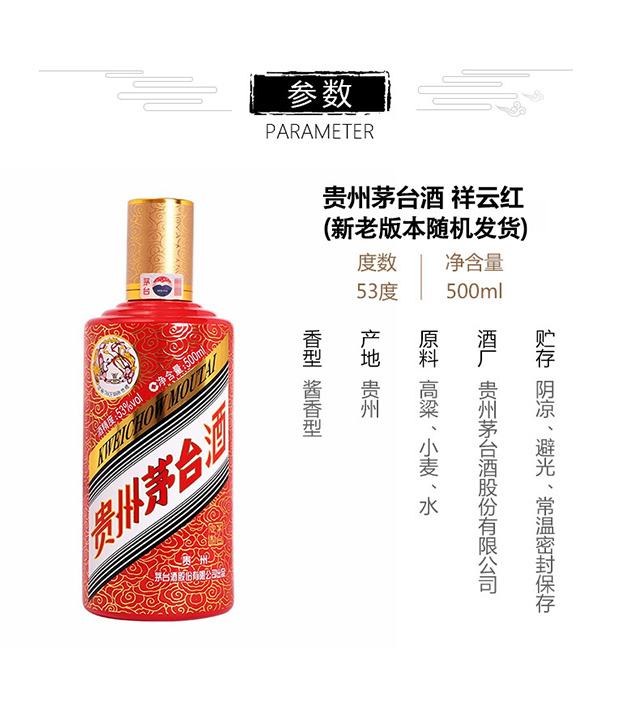 包装:礼盒装;容量:376-499mL;香型:酱香型;产地:贵州;度数:50度及以上;酒精度:53%vol;容量:500ml;产品重量:870g;包装清单:茅台 祥云红 酱香型白酒 53度500ml单瓶装(新老版本随机发货)*1;
