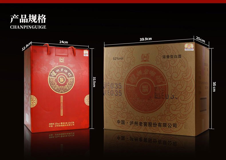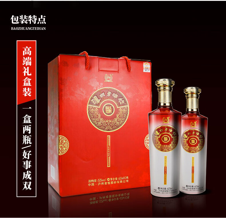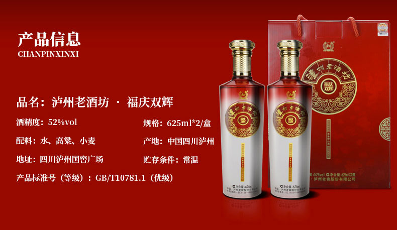包装:整箱装;容量:500-749mL;香型:浓香型;产地:四川;度数:50度及以上;酒精度:52%vol;容量:625ml*2瓶*3盒;产品重量:8850g;包装清单:福庆双辉 52度 625ml*2*3瓶;