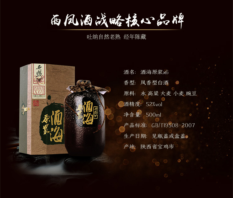 包装:整箱装;容量:500-749mL;香型:凤香型;产地:陕西;度数:50度及以上;酒精度:52%vol;容量:500ml;产品重量:8000g;包装清单:500ml *6瓶;