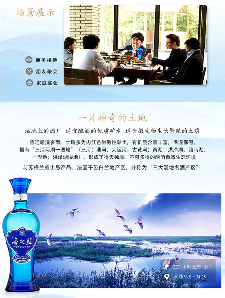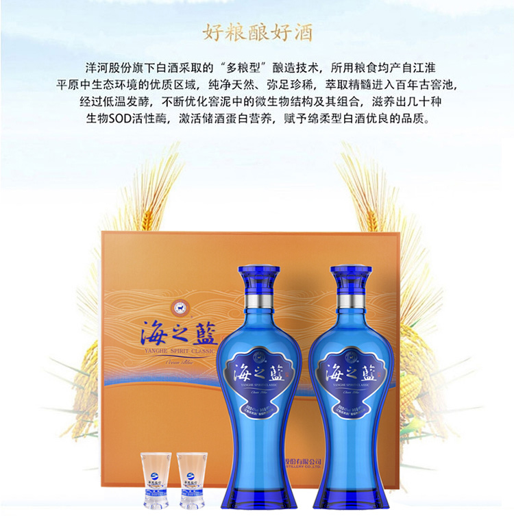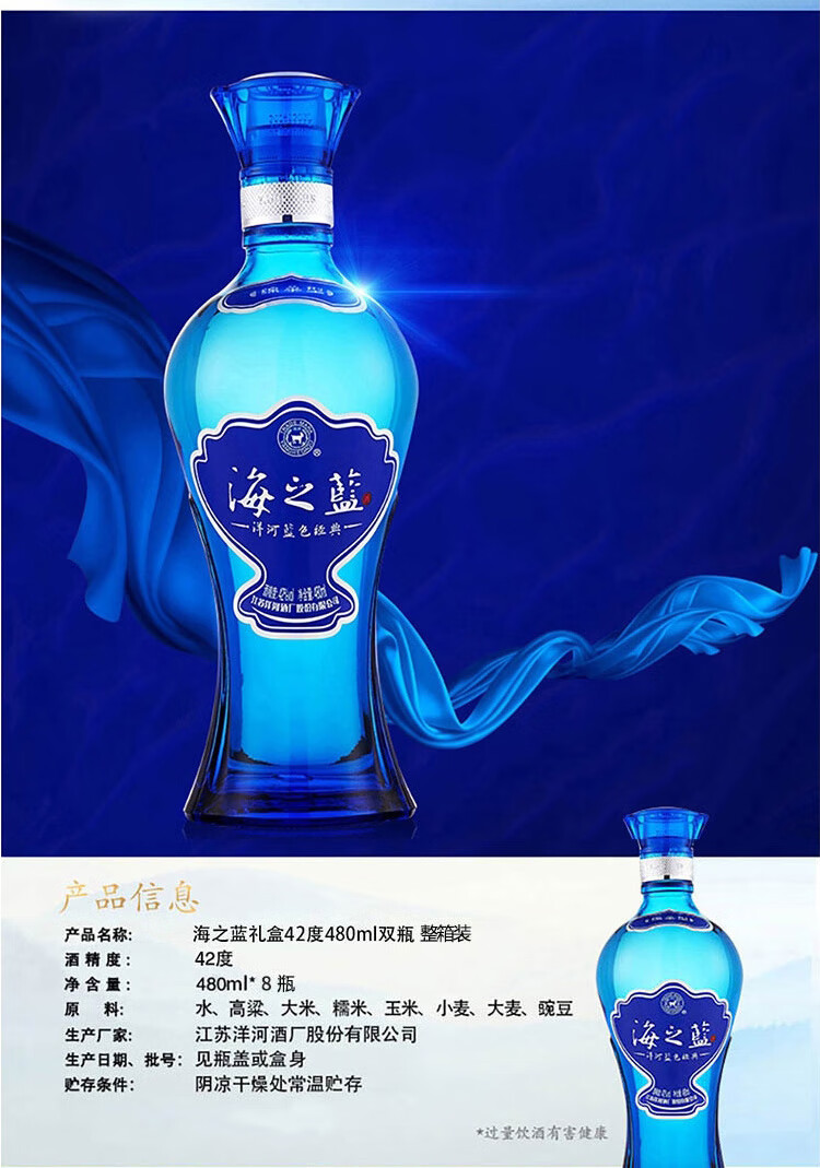 包装:整箱装;容量:376-499mL;香型:浓香型;产地:江苏;度数:40-49度;酒精度:42%vol;容量:480ml;产品重量:20300g;包装清单:洋河蓝色经典 海之蓝 42度 480ml*2瓶*4盒 整箱装(内含4个礼袋)口感绵柔浓香型白酒;