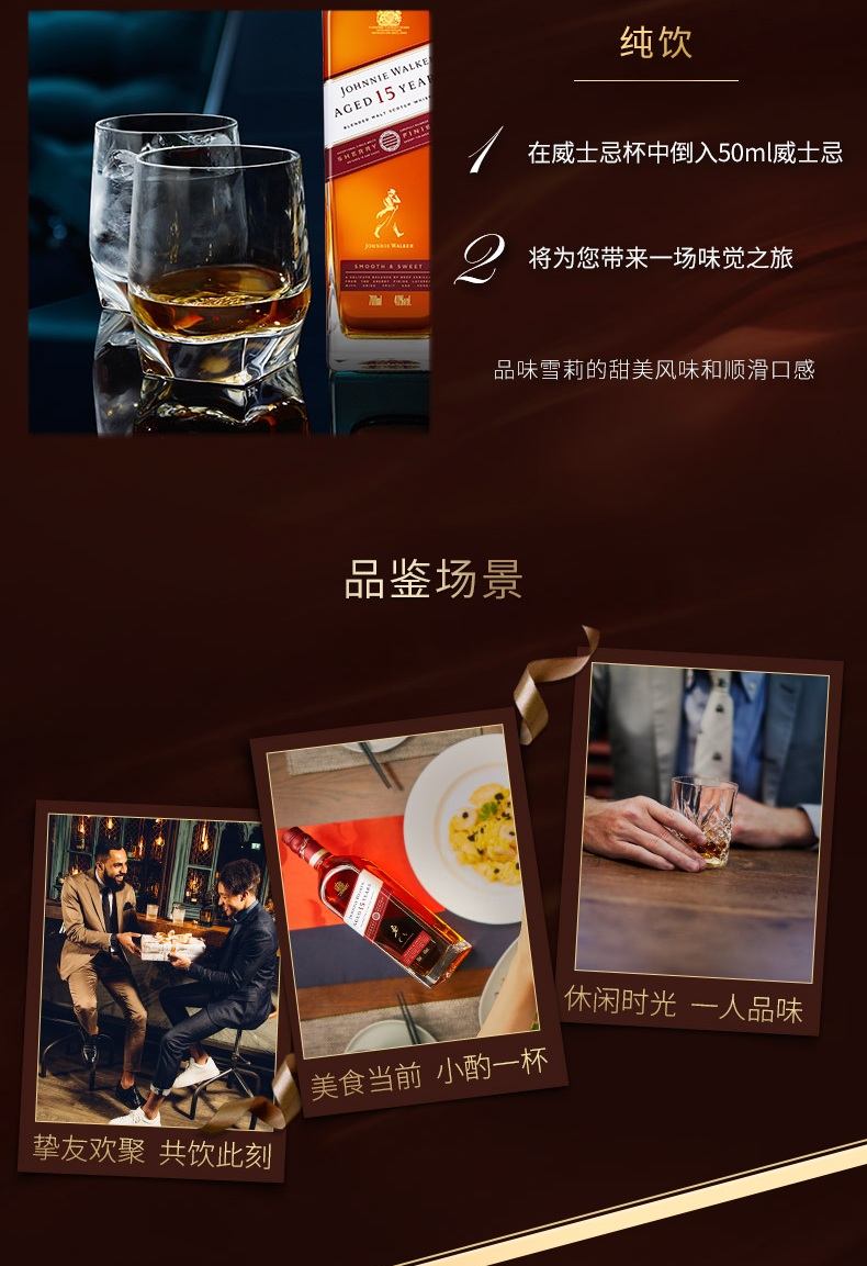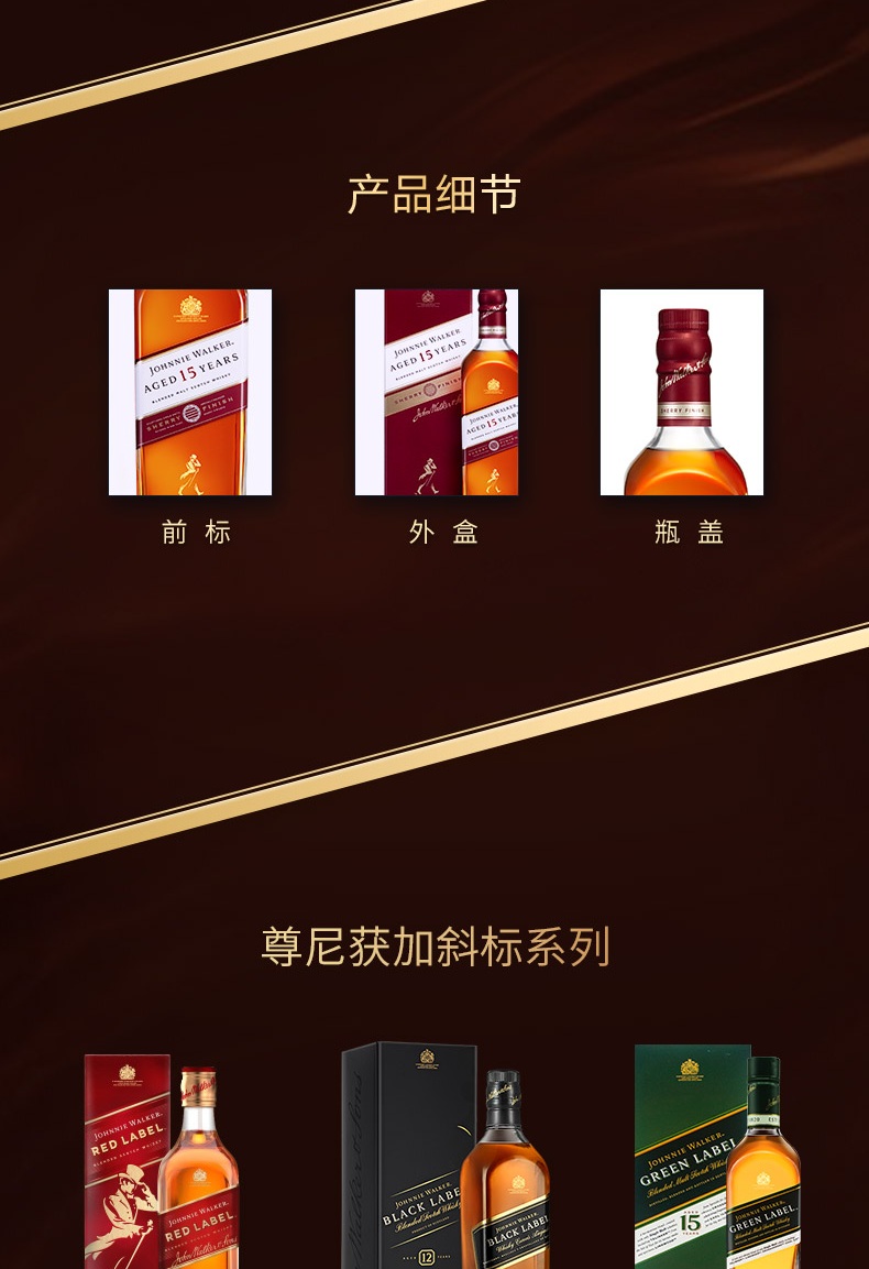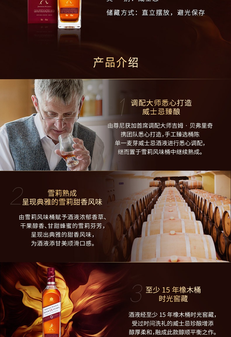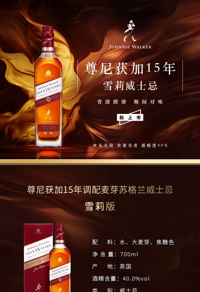 类型:调和威士忌;产地:苏格兰;适用场景:自斟自饮,亲友馈赠,家庭聚会,商务宴请,情侣约会,闺蜜私语;包装:瓶装;容量:700-999mL;阶段:进阶优选;原料:水、大麦芽、焦糖色;保质期:无;酒精度:40%vol;存储方法:直立摆放 避光保存;产品重量:9.21kg;容量:700mL;包装清单:尊尼获加 (JOHNNIE WALKER )洋酒 15年 苏格兰进口调配麦芽威士忌700ml雪莉版*1 外盒*1个;