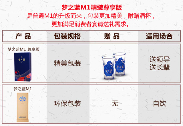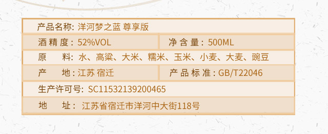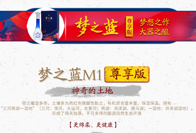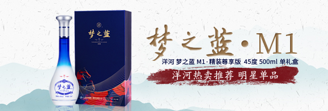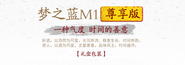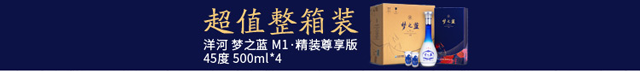 包装:整箱装;容量:500-749mL;香型:浓香型;产地:江苏;度数:50度及以上;酒精度:52%vol;容量:500ml;产品重量:9000g;包装清单:洋河 梦之蓝 M1·精装尊享版 52度 500ml*4瓶 整箱装;