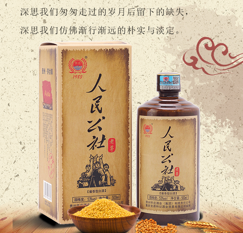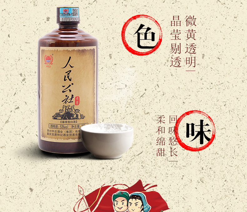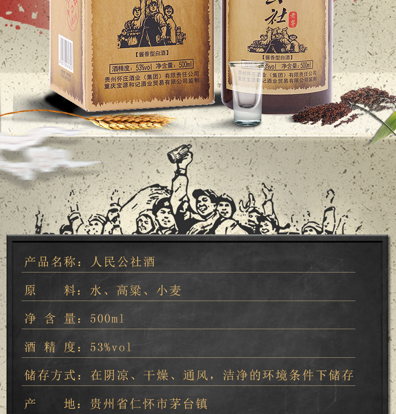 包装:整箱装;容量:500-749mL;香型:酱香型;产地:贵州;度数:50度及以上;酒精度:53%vol;容量:500ml;产品重量:7500g;包装清单:人民公社整件6瓶,含手提袋是三个;