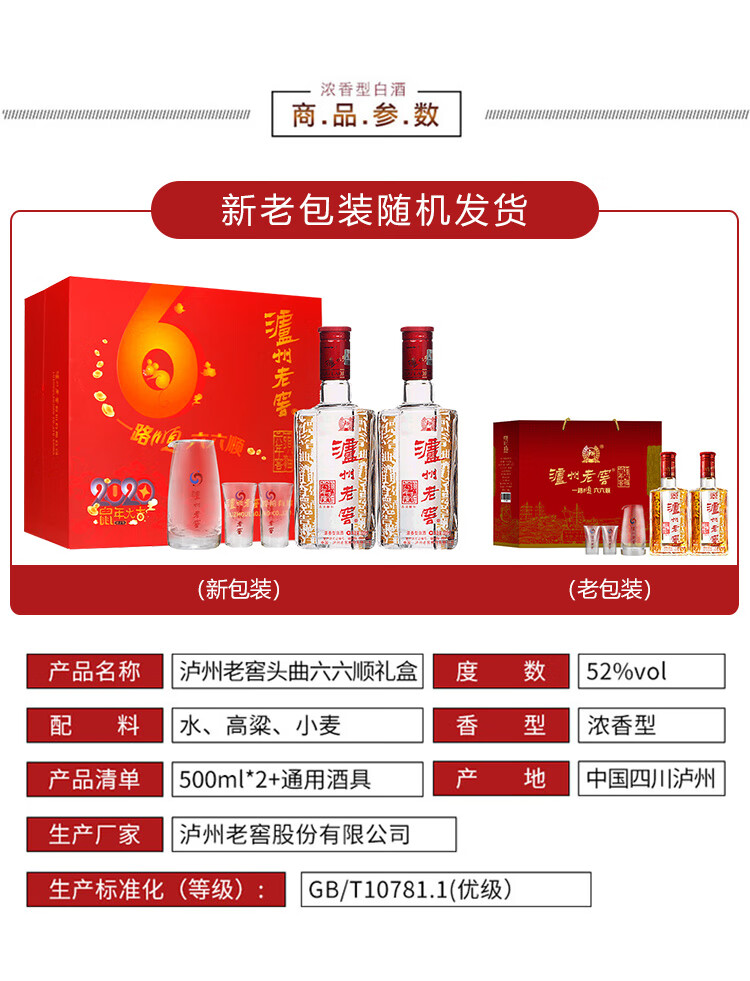 包装:礼盒装;容量:500-749mL;香型:浓香型;产地:四川;度数:50度及以上;酒精度:52%vol;容量:500ml*2;产品重量:3100g;包装清单:泸州老窖 六年窖头曲 52度500ml*2+通用酒具;