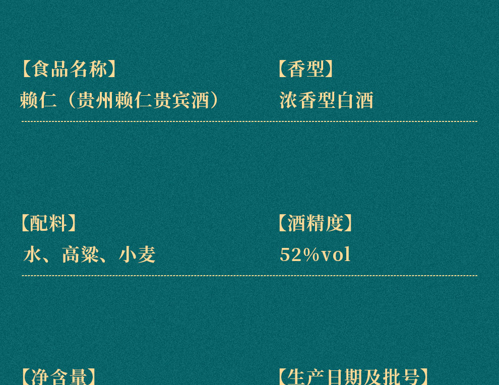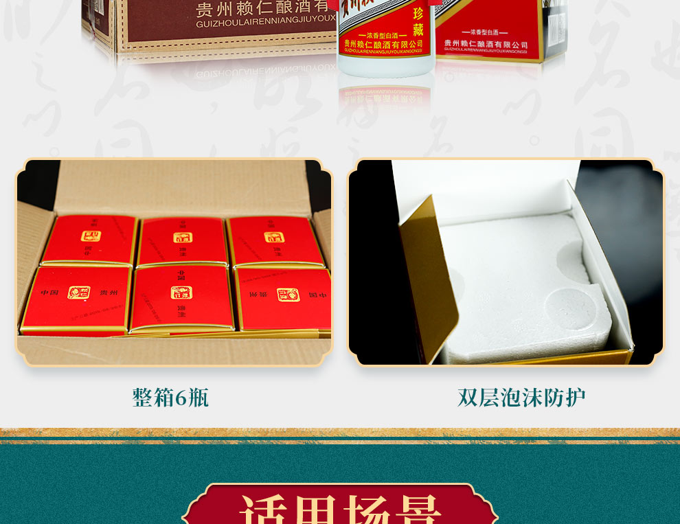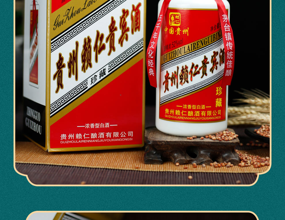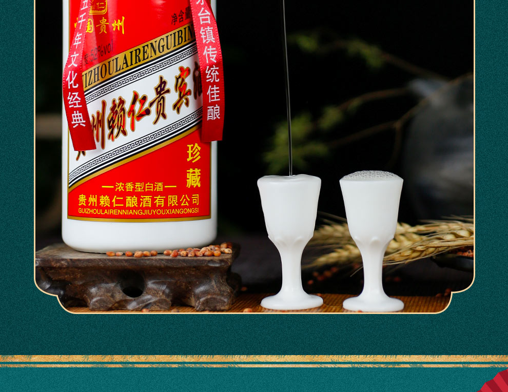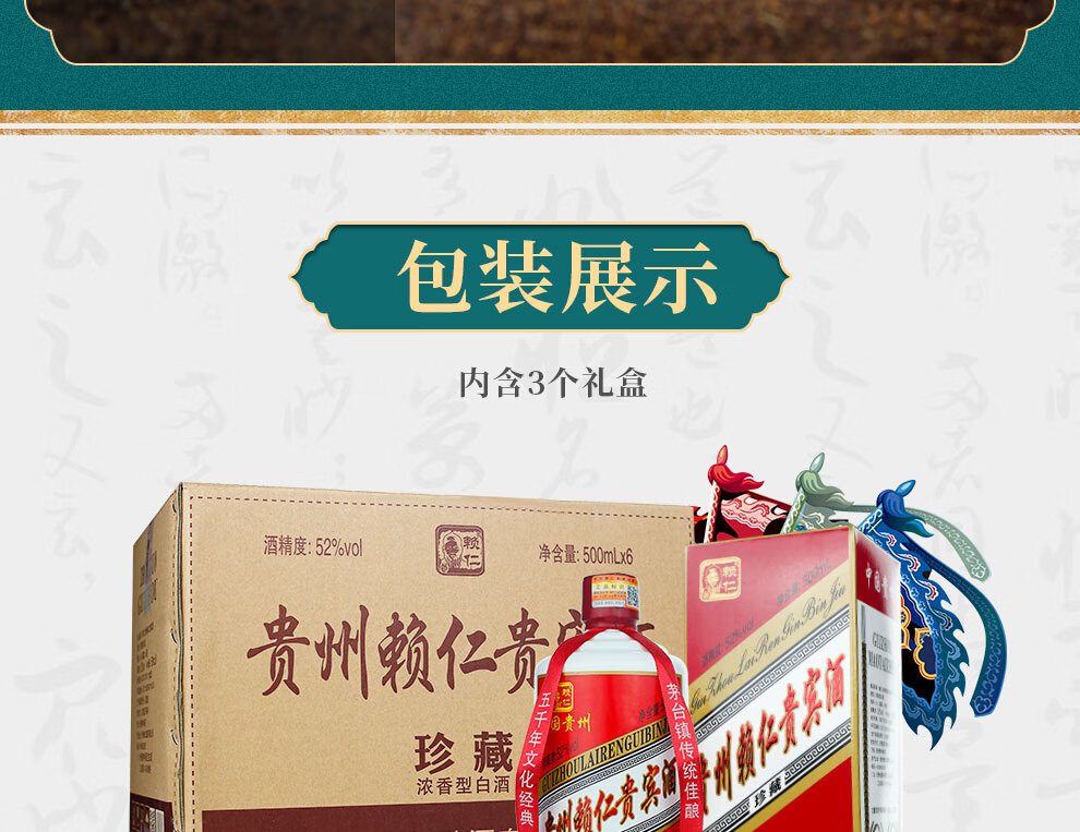 包装:整箱装;容量:500-749mL;香型:浓香型;产地:贵州;度数:50度及以上;酒精度:52%vol;容量:500ml*6;产品重量:6000g;包装清单:赖仁茅台镇贵宾酒500ml*6瓶整箱装*1;
