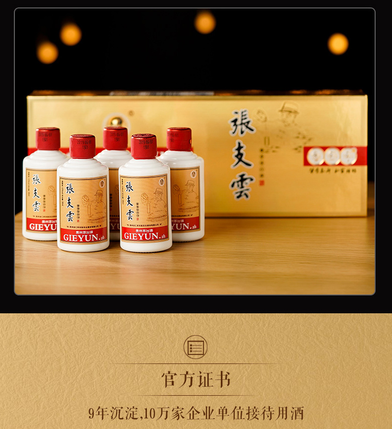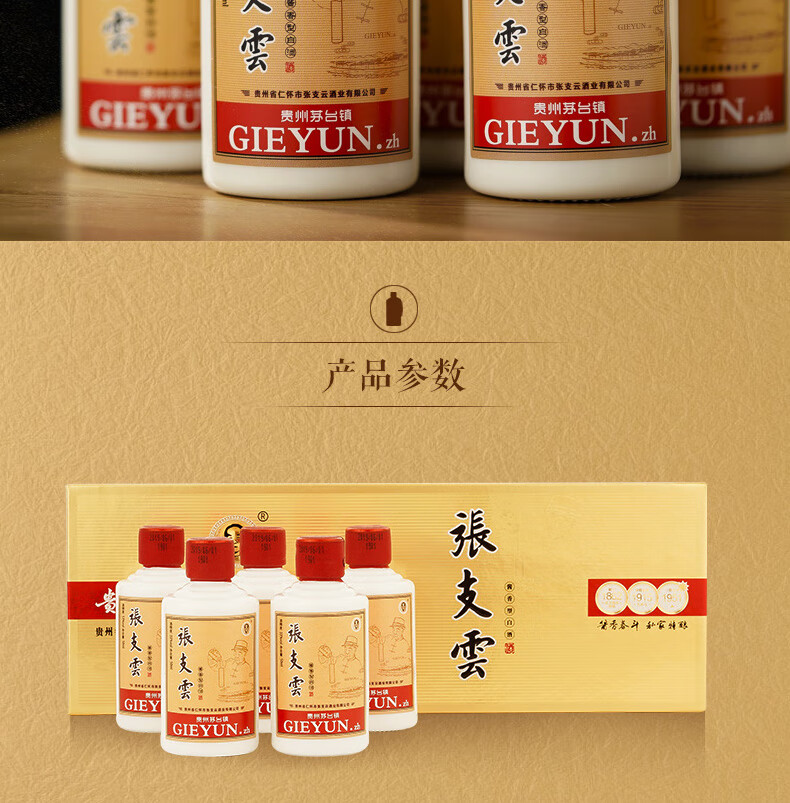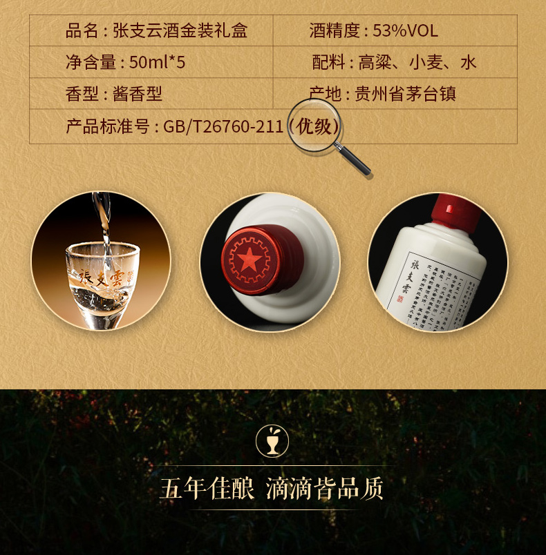 包装:礼盒装;容量:375mL及以下;香型:酱香型;产地:贵州;度数:50度及以上;酒精度:53%vol;容量:50ML*5瓶;产品重量:1100g;包装清单:50ml*5瓶+礼盒;