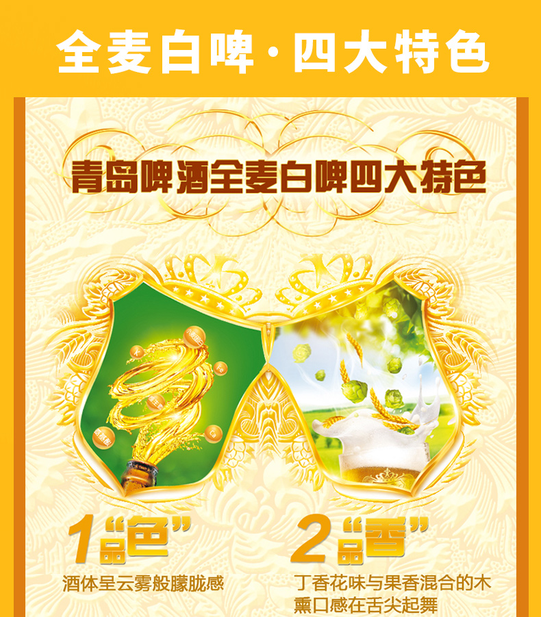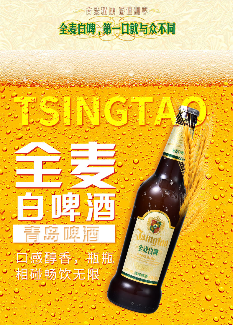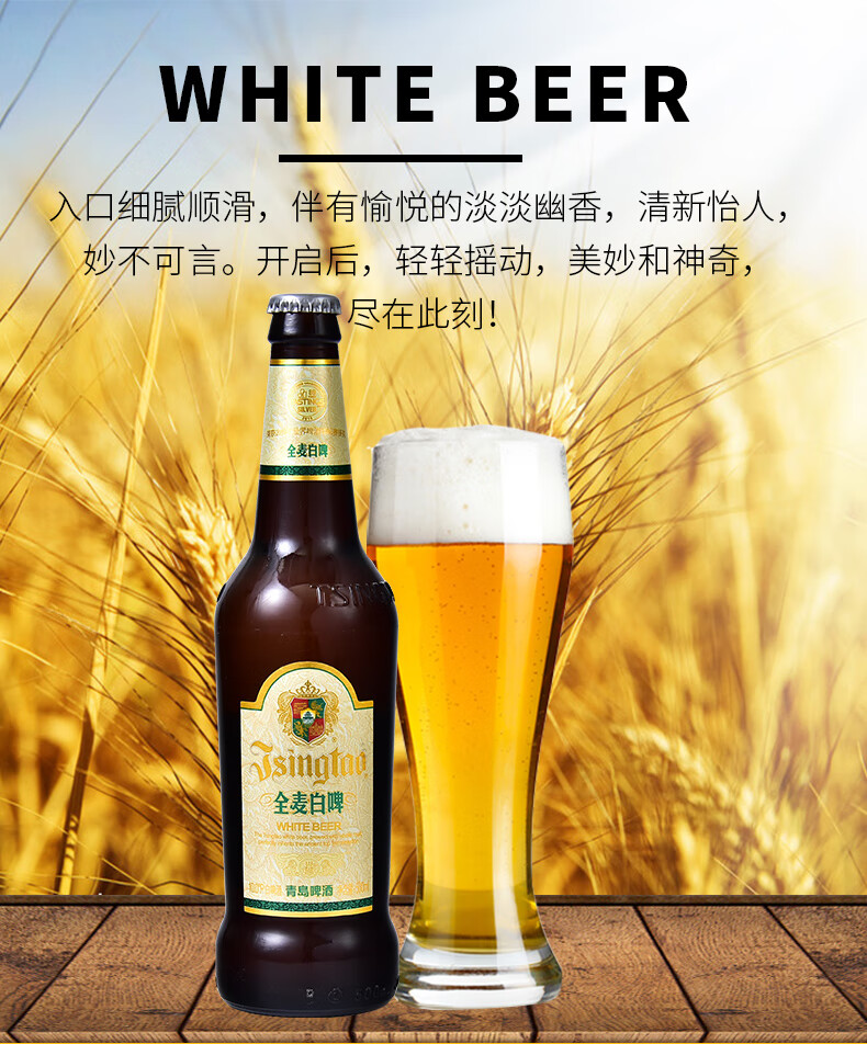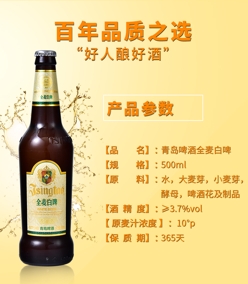 适用场景:礼节拜访,家庭聚会;包装:整箱装;容量:500mL;类别:白啤酒;国产/进口:国产;原料:水、大麦芽、小麦芽、酵母、啤酒花;保质期:365天;酒精度:3.7%vol;原产地:中国大陆;原麦汁浓度:10°P;存储方法:禁止加热或0度以下冷冻;产品重量:11.5kg;容量:500ml;包装清单:青岛啤酒(TsingTao)全麦白啤 10度 500ml*12瓶 整箱装 商务宴请 古法精酿;