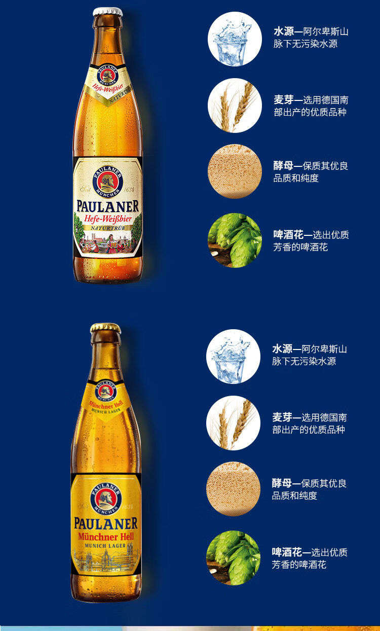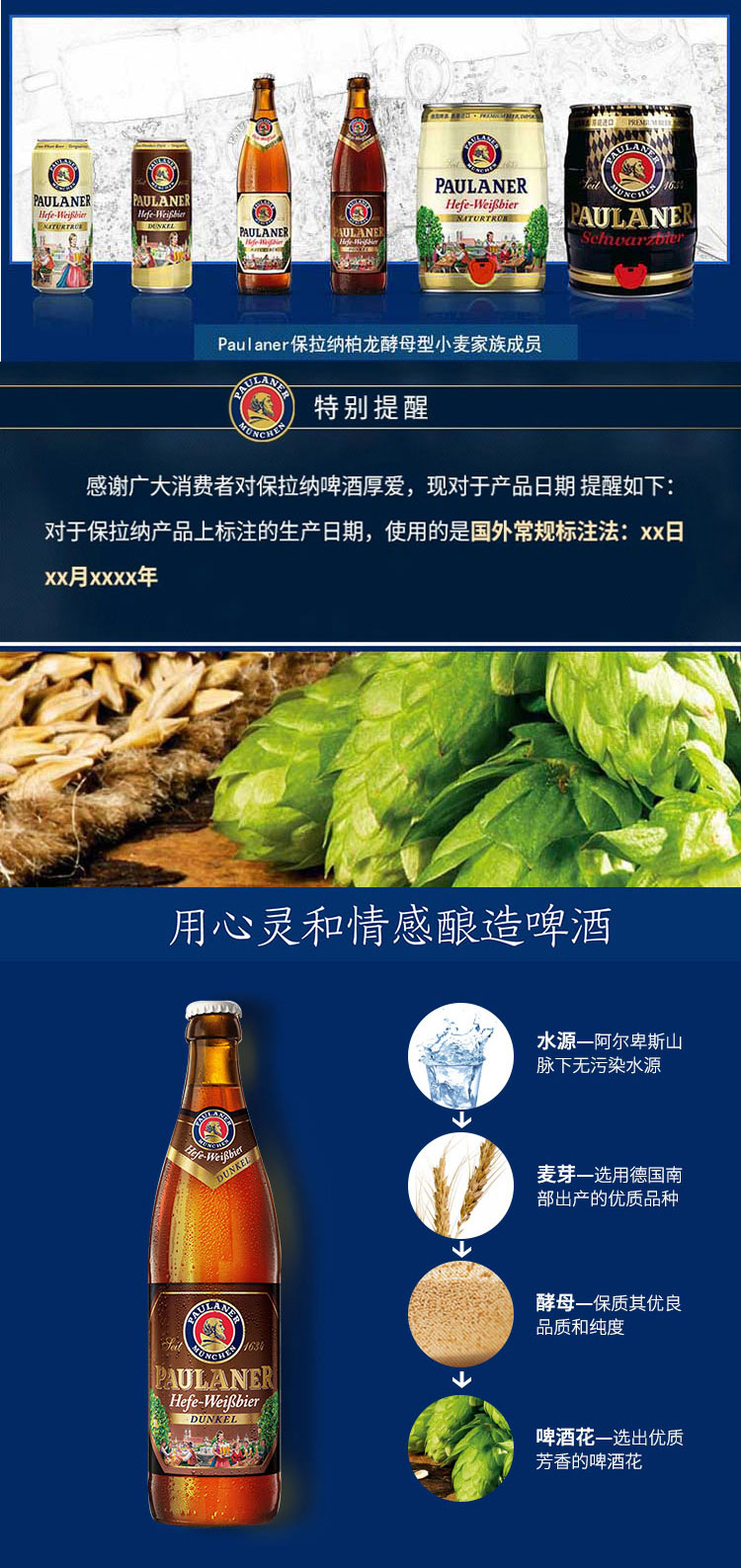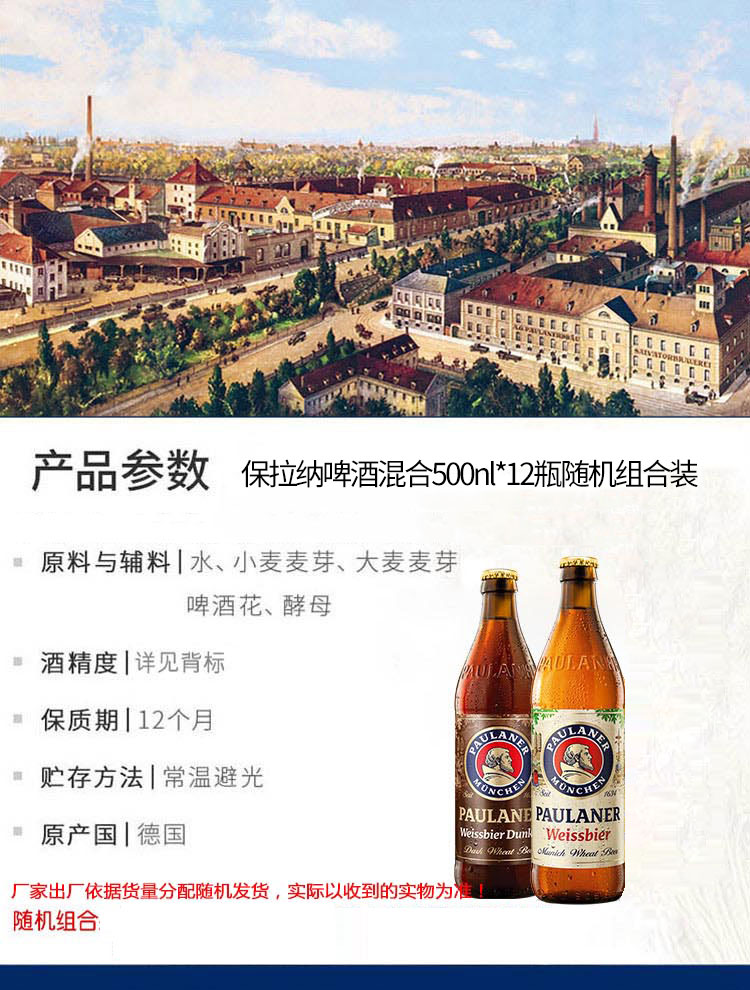 国产/进口:进口;产地:德国;适用场景:野餐出游,家庭聚会,自斟自饮,烧烤撸串,派对必备;包装:礼盒装;容量:500mL以上;类别:其它;原料:水、麦芽、啤酒花、;系列:酵母型啤酒;保质期:365天;酒精度:5.5%vol;原产地:德国;原麦汁浓度:12.5°P;存储方法:常温避光保存;产品重量:9.75kg;容量:500ml;包装清单:保拉纳/柏龙(PAULANER) 啤酒混合装 500ml*12瓶 随机组合装 德国进口*1;
