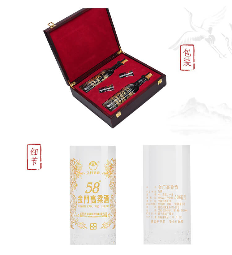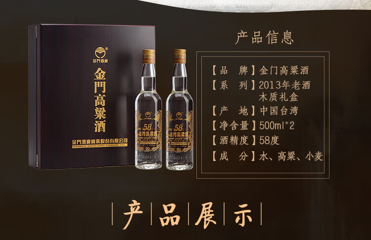包装:礼盒装;容量:750mL及以上;香型:其它;产地:中国台湾;度数:50度及以上;酒精度:58%vol;容量:500ml*2;产品重量:3960g;包装清单:金门高粱酒 白酒 2013年老酒木质礼盒 清香型 58度 500ml*2×1 礼盒装;