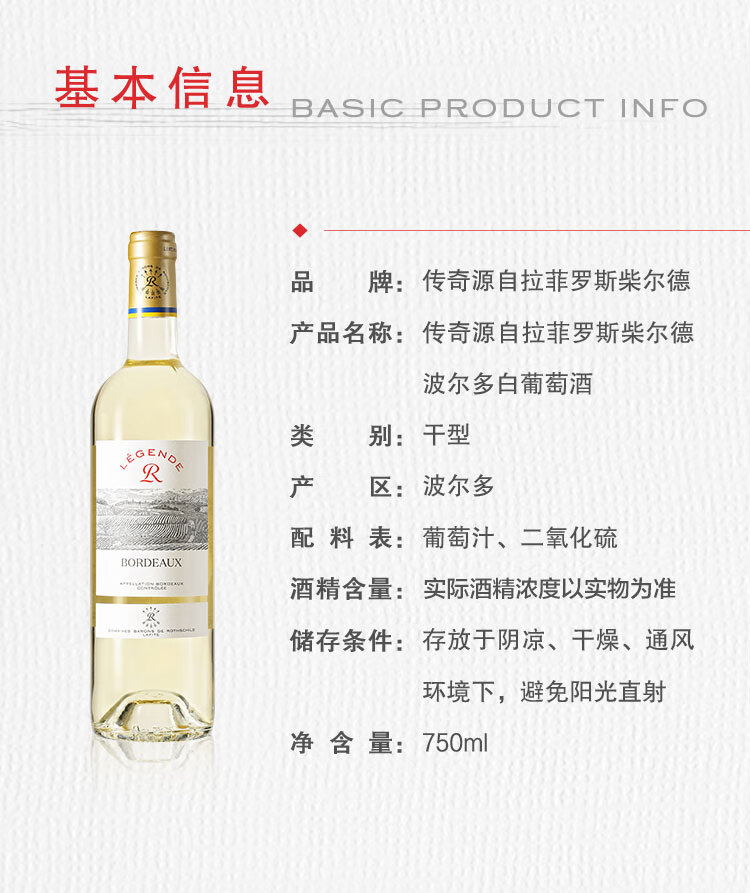颜色:琥珀;口感:饱满;特性:精品葡萄酒,名庄葡萄酒,法定产区酒(AOC/AOP等);国产/进口:进口;适用场景:礼节拜访,商务宴请,婚礼婚宴,情侣约会,家庭聚会,收藏,自斟自饮,闺蜜私语,派对活动;包装:瓶装;类别:白葡萄酒;葡萄品种:赛美蓉(Semillon),长相思(Sauvignon Blanc);产地:法国;容量:750mL;甜度:干型;系列:传奇系列;保质期:无质保;酒精度:见瓶标;原产地:法国;存储方法:阴凉通风干燥;容量:750ml;产品重量:1.2kg;包装清单:红酒*1;