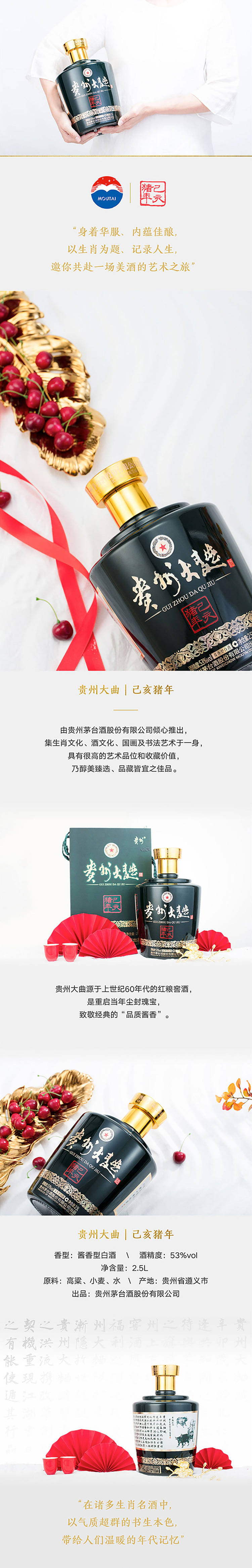 包装:瓶装;容量:750mL及以上;香型:酱香型;度数:50度及以上;香型:酱香型;产地:贵州;酒精度:53%;包装:瓶装;产品重量:8100g;容量:2.5L;包装清单:茅台(MOUTAI)贵州大曲酒(己亥猪年)生肖酒 53度 白酒 2.5L 单瓶装 口感酱香型*2;