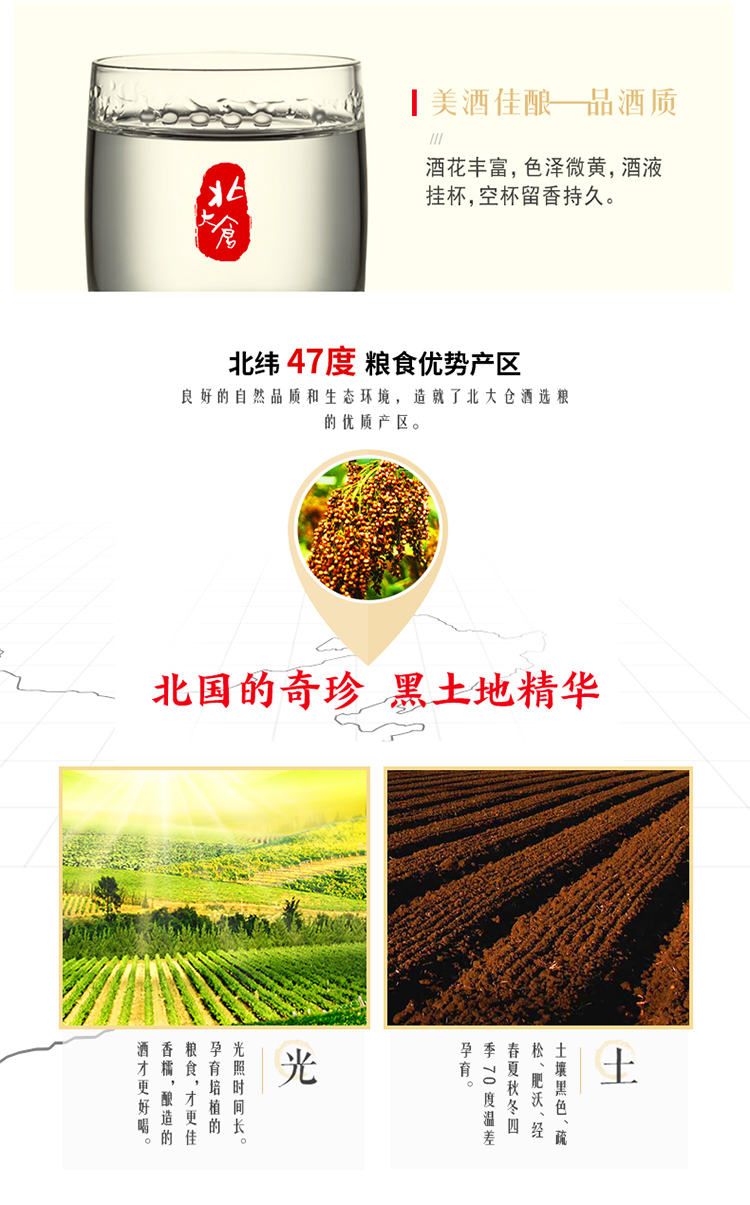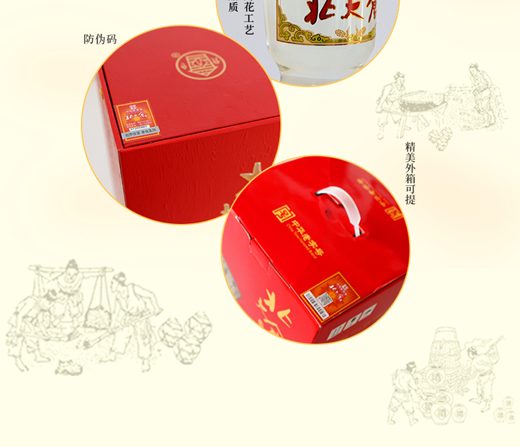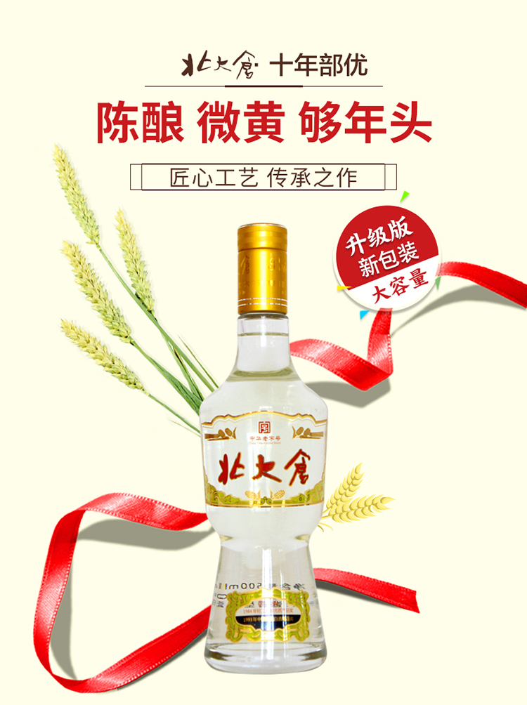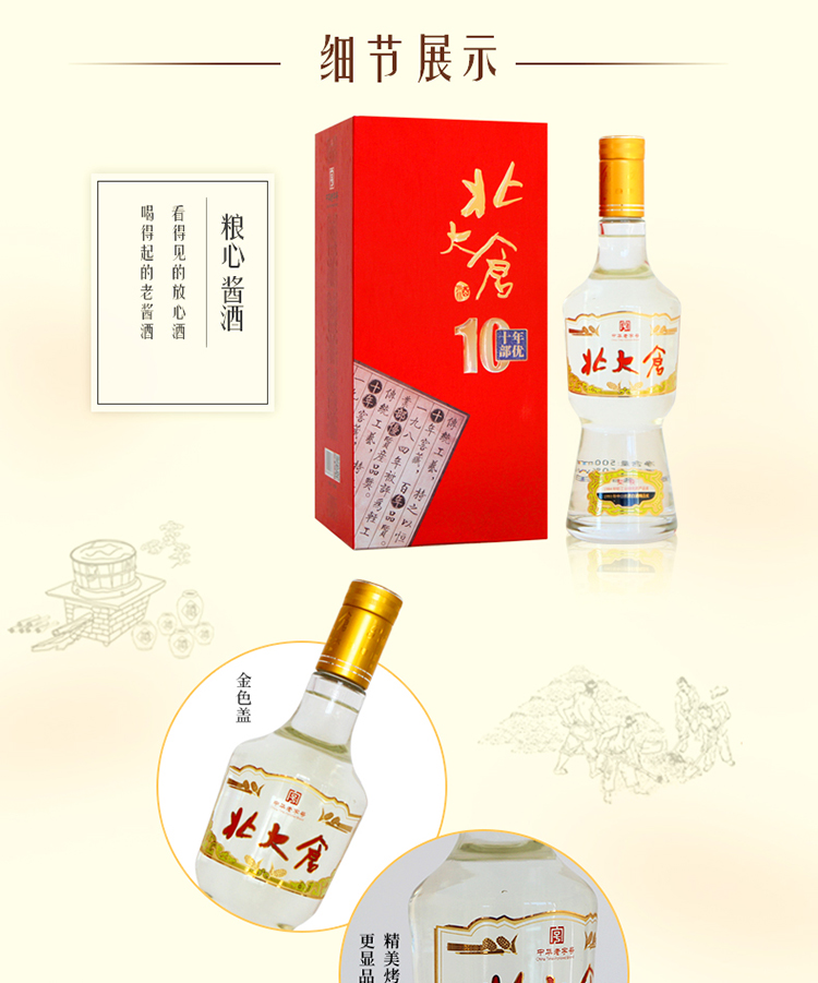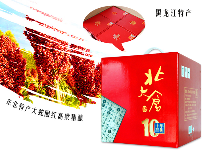 包装:整箱装;容量:500-749mL;香型:酱香型;产地:黑龙江;度数:50度及以上;酒精度:50%vol;容量:500ml*6瓶;产品重量:6050g;包装清单:北大仓 部优十年 50度 酱香型白酒 500ML*4瓶 整箱装;