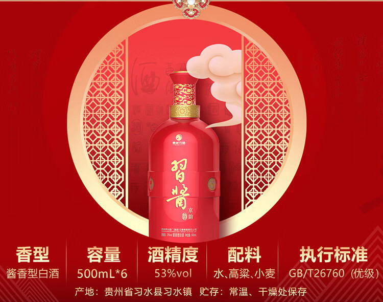 包装:整箱装;容量:500-749mL;香型:酱香型;产地:贵州;度数:50度及以上;酒精度:53%vol;容量:500ml;产品重量:7.2g;包装清单:习酒习酱·京韵 53度500ml*6整箱装 X 1;
