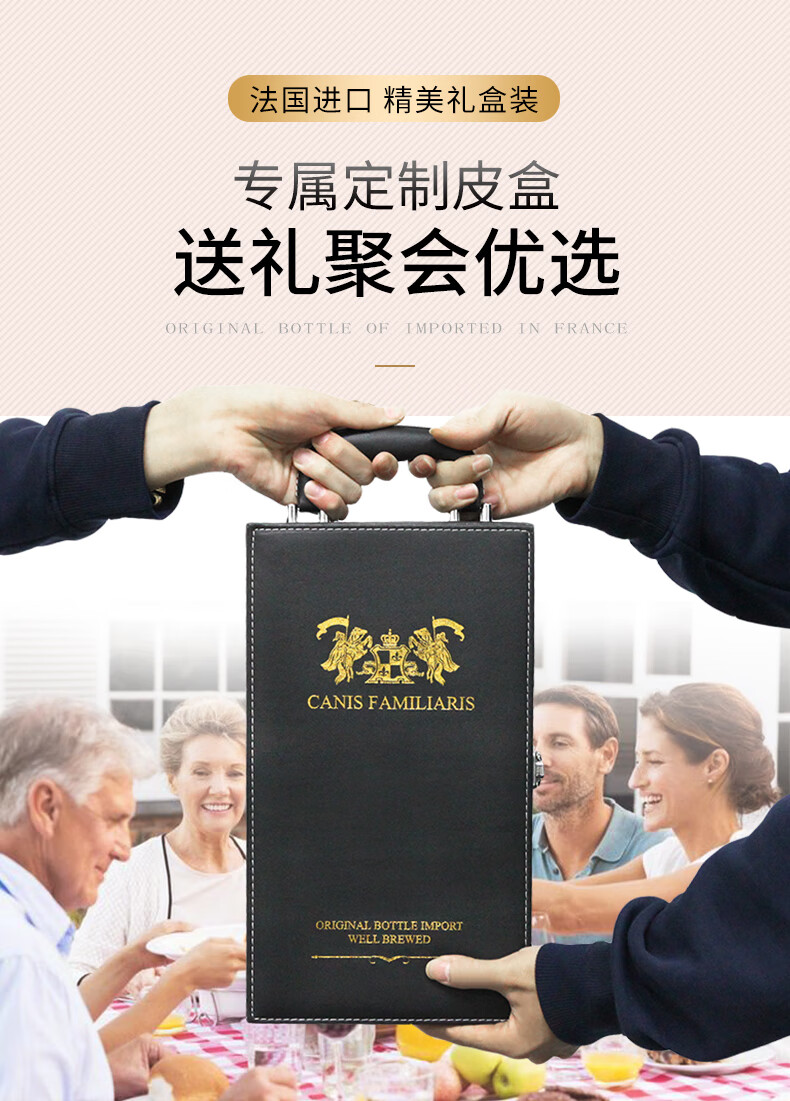 口感:柔和;特性:普通餐酒;国产/进口:进口;适用场景:家庭聚会,礼节拜访,商务宴请,婚礼婚宴,情侣约会,自斟自饮,闺蜜私语,派对活动,收藏;包装:整箱装;酸度:低酸;类别:红葡萄酒;葡萄品种:梅洛(Merlot),混合(Blending),其它;产地:法国;容量:750mL;甜度:干型;保质期:3650天;酒精度:13;原产地:法国;存储方法:避光存放;容量:750ml;产品重量:3.4kg;包装清单:红酒*2、皮箱*1;