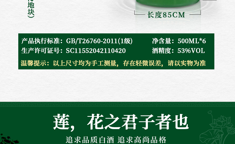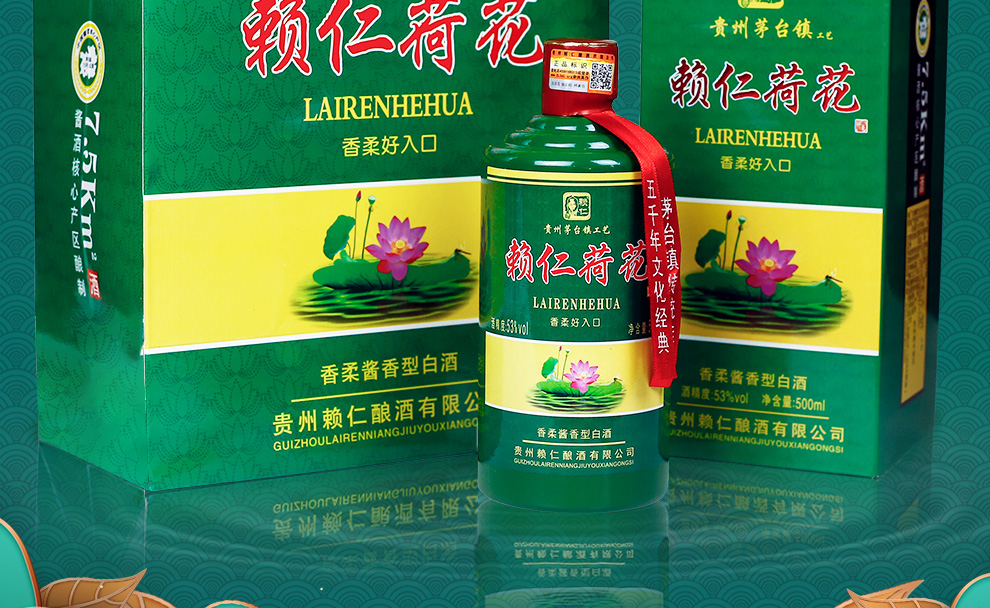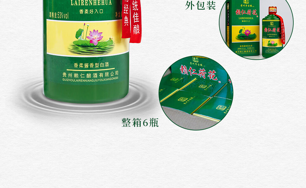 包装:整箱装;容量:500-749mL;香型:酱香型;产地:贵州;度数:50度及以上;酒精度:53%vol;容量:500ml*6;产品重量:6000g;包装清单:赖仁荷花酒53度500ml*6瓶整箱装*1;