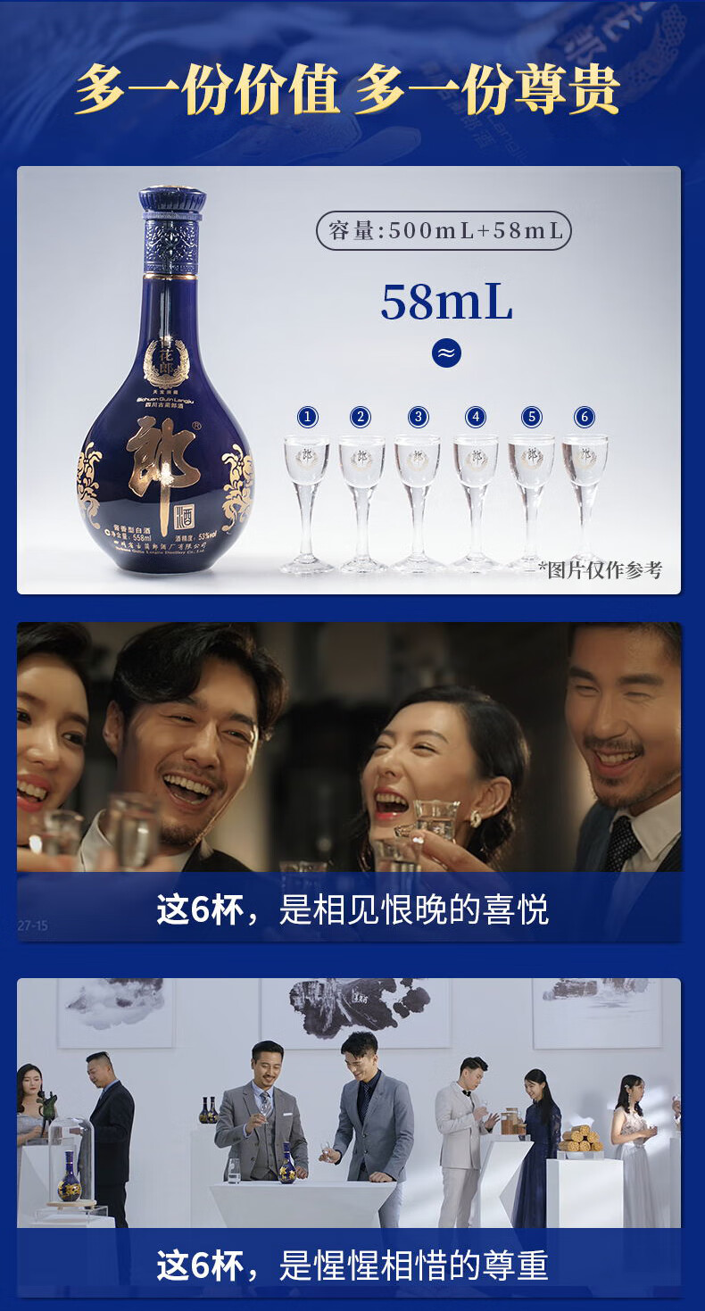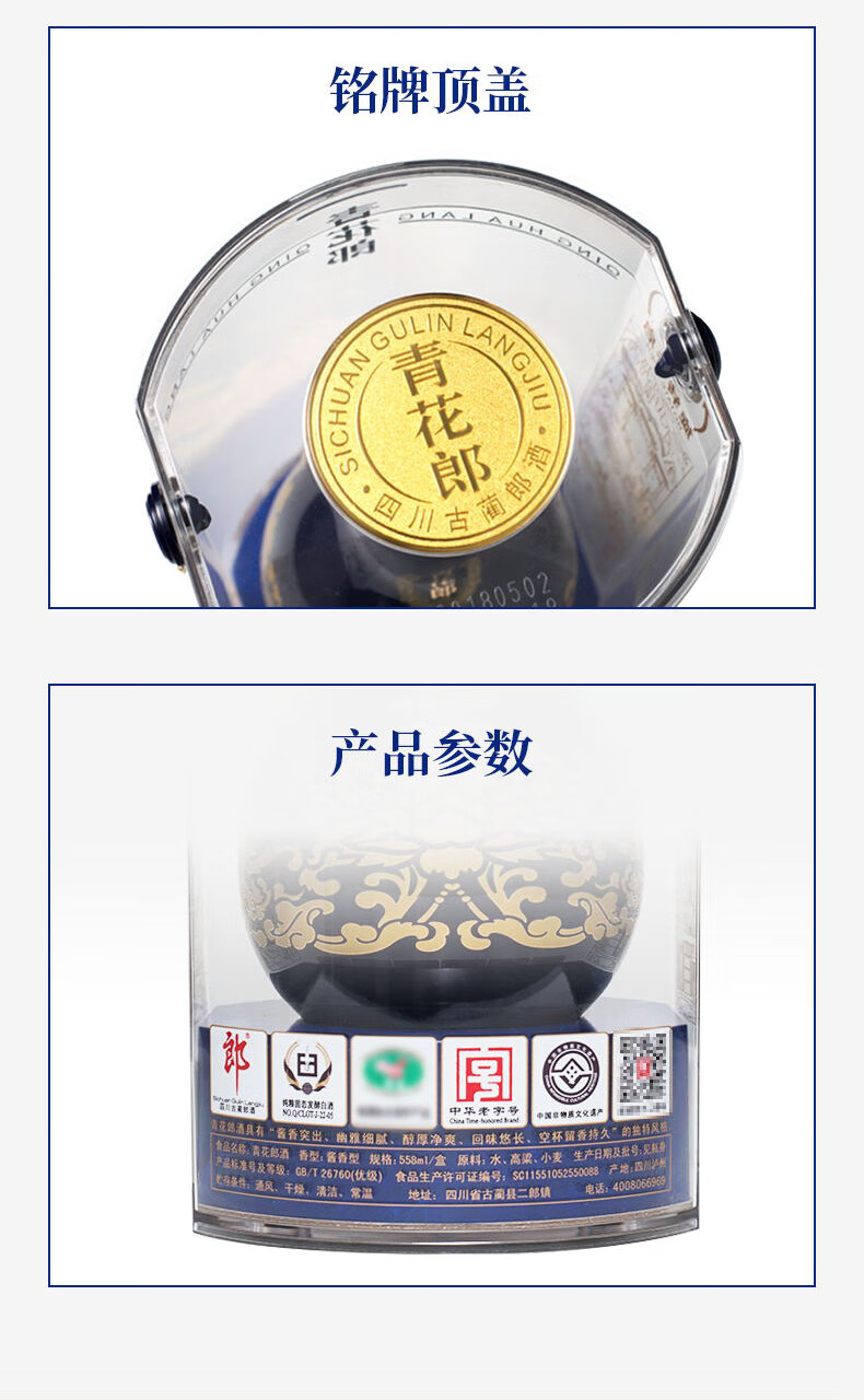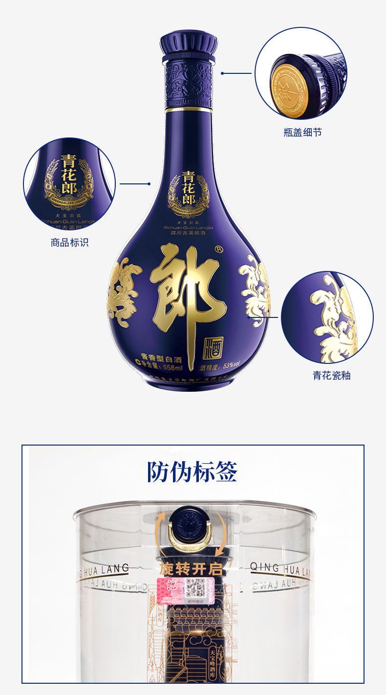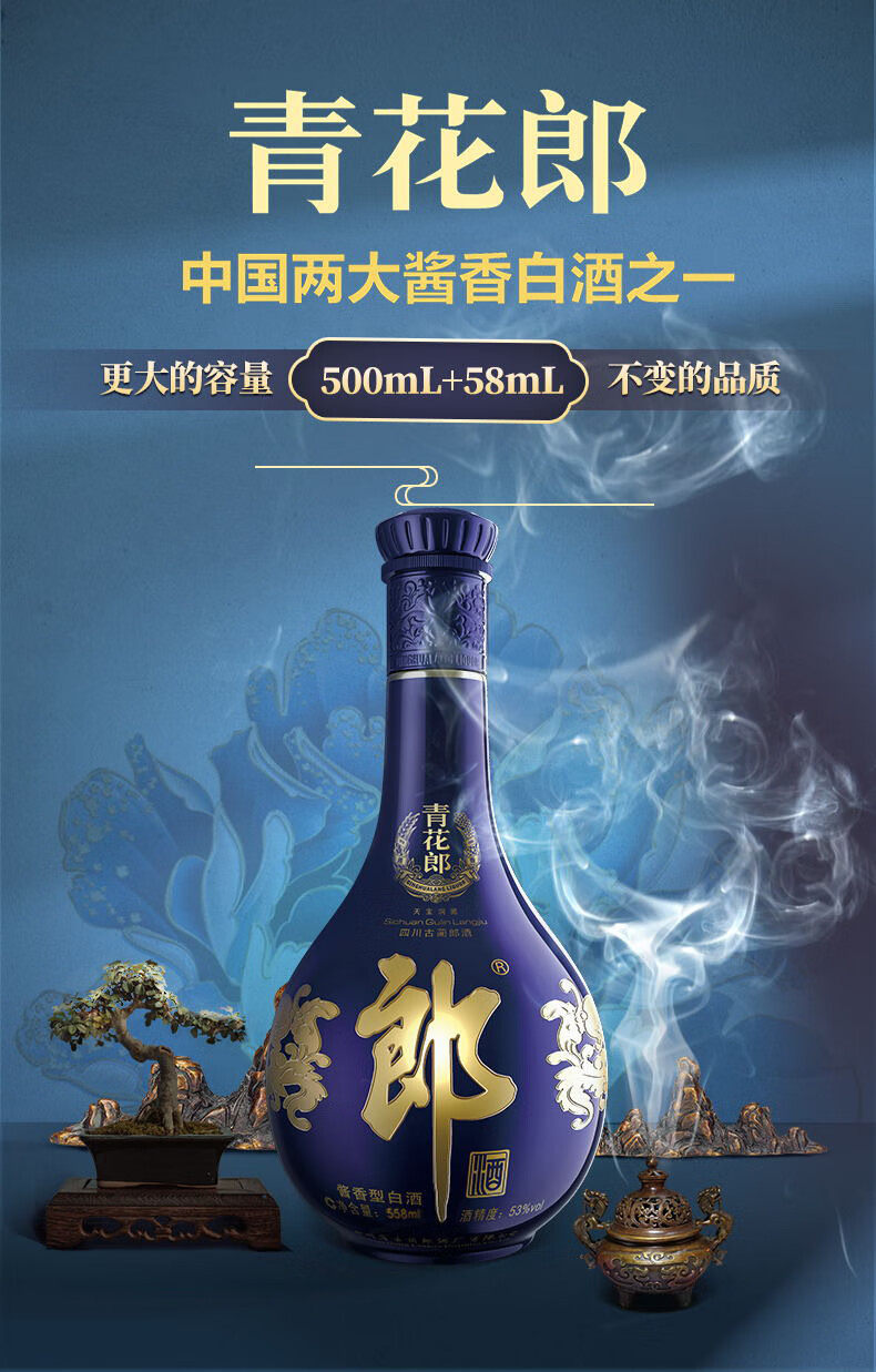 包装:其它;容量:500-749mL;香型:酱香型;产地:四川;度数:50度及以上;酒精度:53%vol;容量:558ml;产品重量:1500g;包装清单:郎酒 青花郎 陈酿 53度 558ml*2瓶;