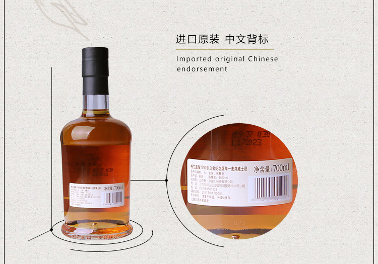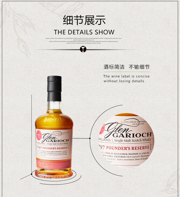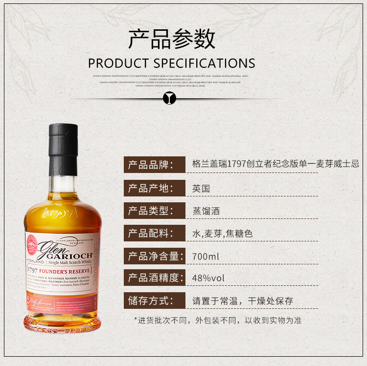 类型:单一麦芽威士忌;产地:苏格兰;适用场景:情侣约会,闺蜜私语,自斟自饮,亲友馈赠,家庭聚会,商务宴请;包装:礼盒装;容量:700-999mL;阶段:进阶优选;原料:水、大麦芽;保质期:长期;酒精度:48%vol;存储方法:放置于干燥阴凉处,避免阳光直射;产品重量:2.2kg;容量:700mL;包装清单:格兰盖瑞(GLEN GARIOCH)英国进口洋酒 1797创立者纪念版单一麦芽威士忌 700ml*1;