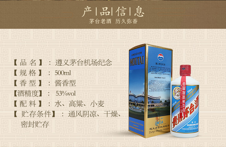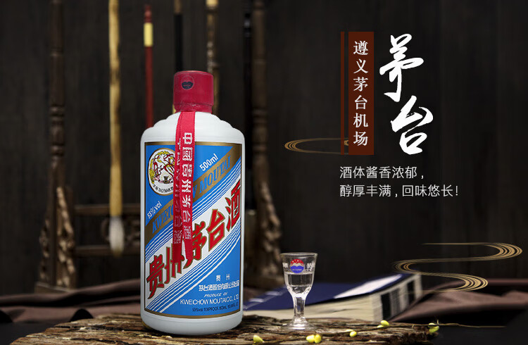 包装:瓶装;容量:500-749mL;香型:酱香型;产地:贵州;度数:50度及以上;酒精度:53%vol;容量:500ml;产品重量:500g;包装清单:茅台 遵义茅台机场 53度 500ml 单瓶装 酱香型白酒*1;