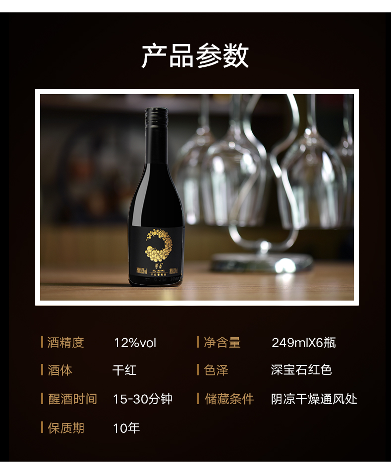口感:柔和;特性:精品葡萄酒;国产/进口:国产;适用场景:家庭聚会,礼节拜访,商务宴请,婚礼婚宴,情侣约会,自斟自饮,闺蜜私语,派对活动;包装:整箱装;类别:红葡萄酒;葡萄品种:赤霞珠(Cabernet Sauvignon);产地:中国大陆;容量:188-374mL;甜度:干型;特性:精品葡萄酒;年份:以产品包装为准;甜度:干型;颜色:宝石红;葡萄品种:赤霞珠(Cabernet Sauvignon);国产/进口:国产;保质期:3650天;酒精度:12%vol(度);原产地:中国大陆;存储方法:避免阳光直射,于5℃~25℃干燥通风处卧放或倒放为宜。;口感:柔和;产区:其它;类别:红葡萄酒;包装:整箱装;产品重量:1.5kg;容量:249ml;包装清单:葡萄酒 整箱装 249ml*6瓶;